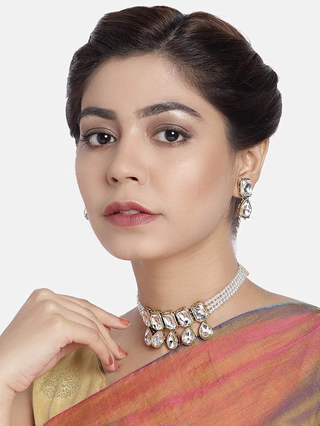 This jewellery set is crafted in 18K gold plating and consists of a Choker and a pair of earrings. The choker necklace feature beads & pearls-studded in it and is secured with a drawstring closures. Style this necklace set with a saree or a salwar suit to enhance the look.