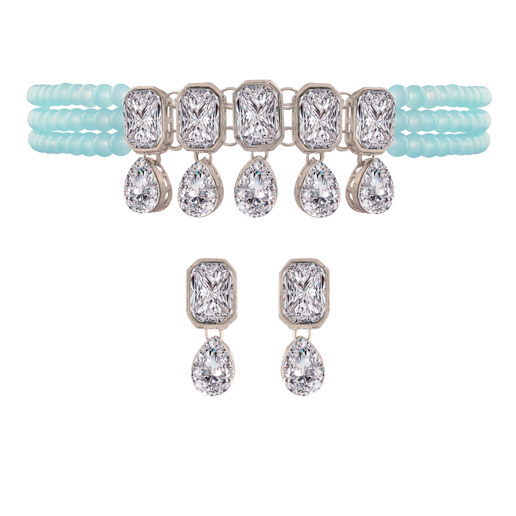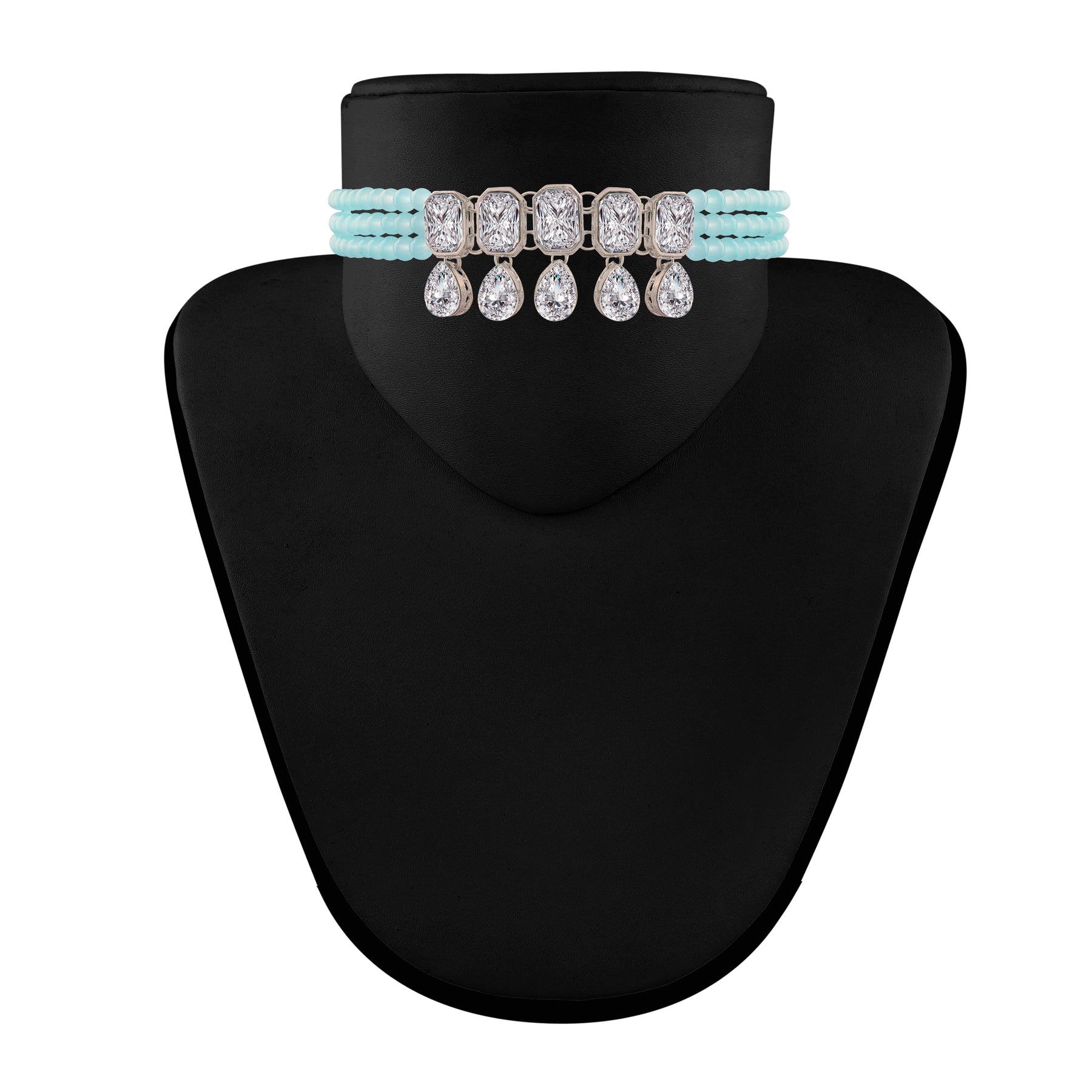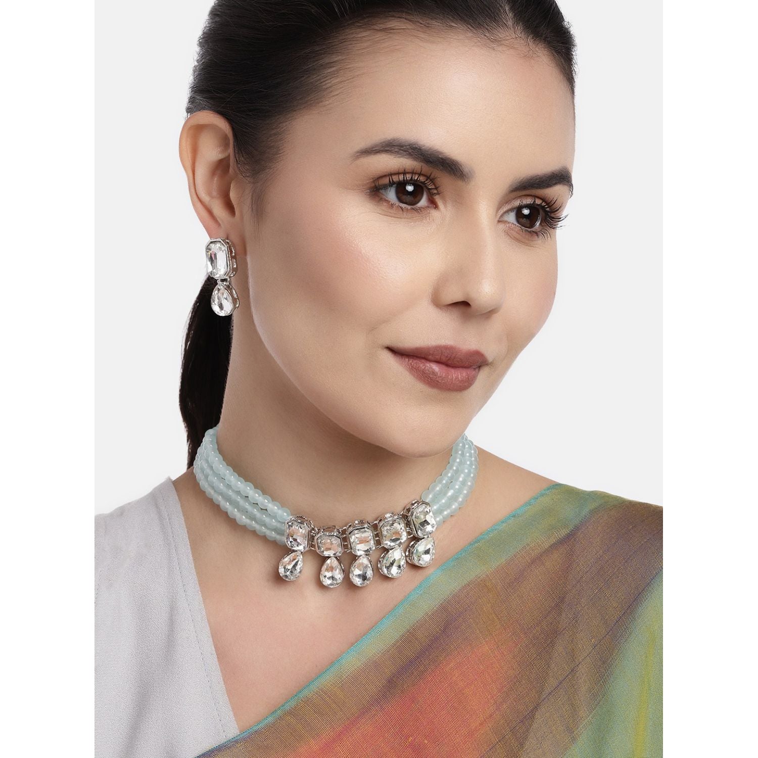 This jewellery set is crafted in 18K Rhodium plating and consists of a choker and a pair of earrings. The choker necklace feature beads & stone-studded in it and is secured with a drawstring closures. Style this necklace set with a saree or a salwar suit to enhance the look.