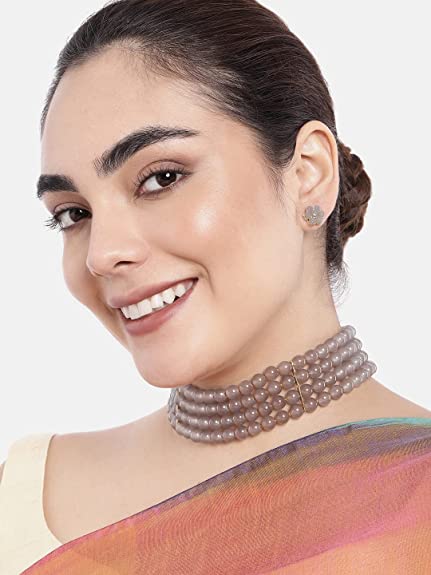 This jewellery set is crafted in 18K gold plated traditional light weight beaded choker set glided with moti work. The necklace feature beads & moti work in it and is secured with a drawstring closures. Style this necklace set with a saree or a salwar suit to enhance the look.
