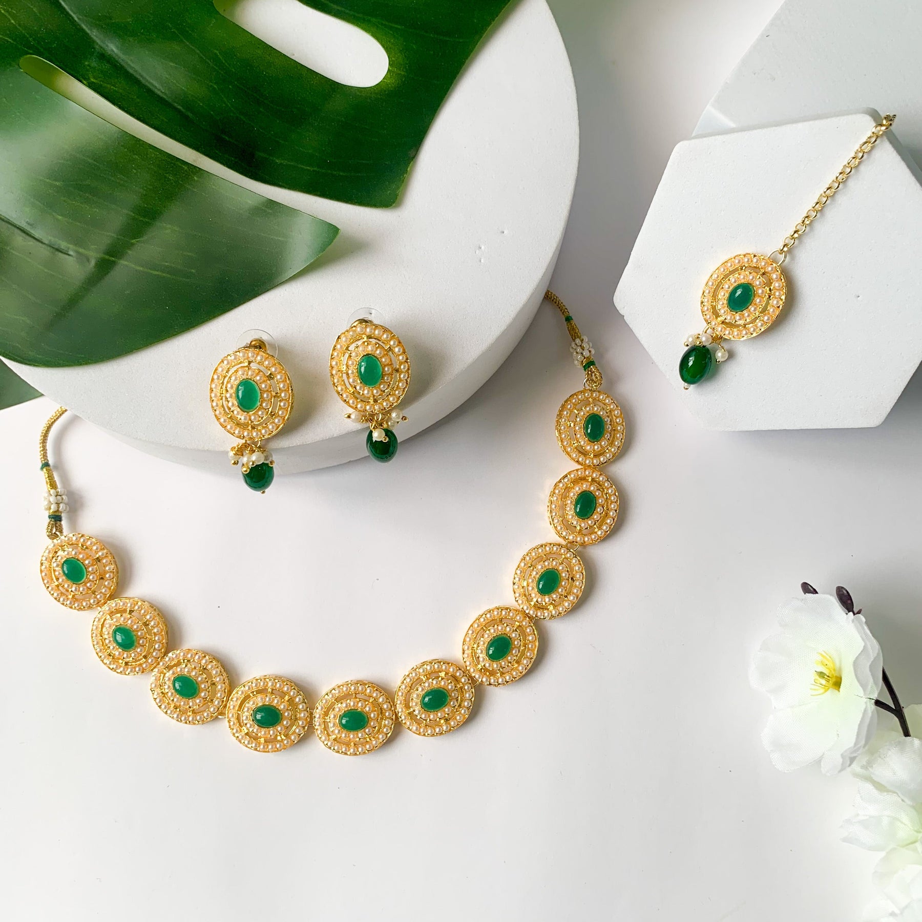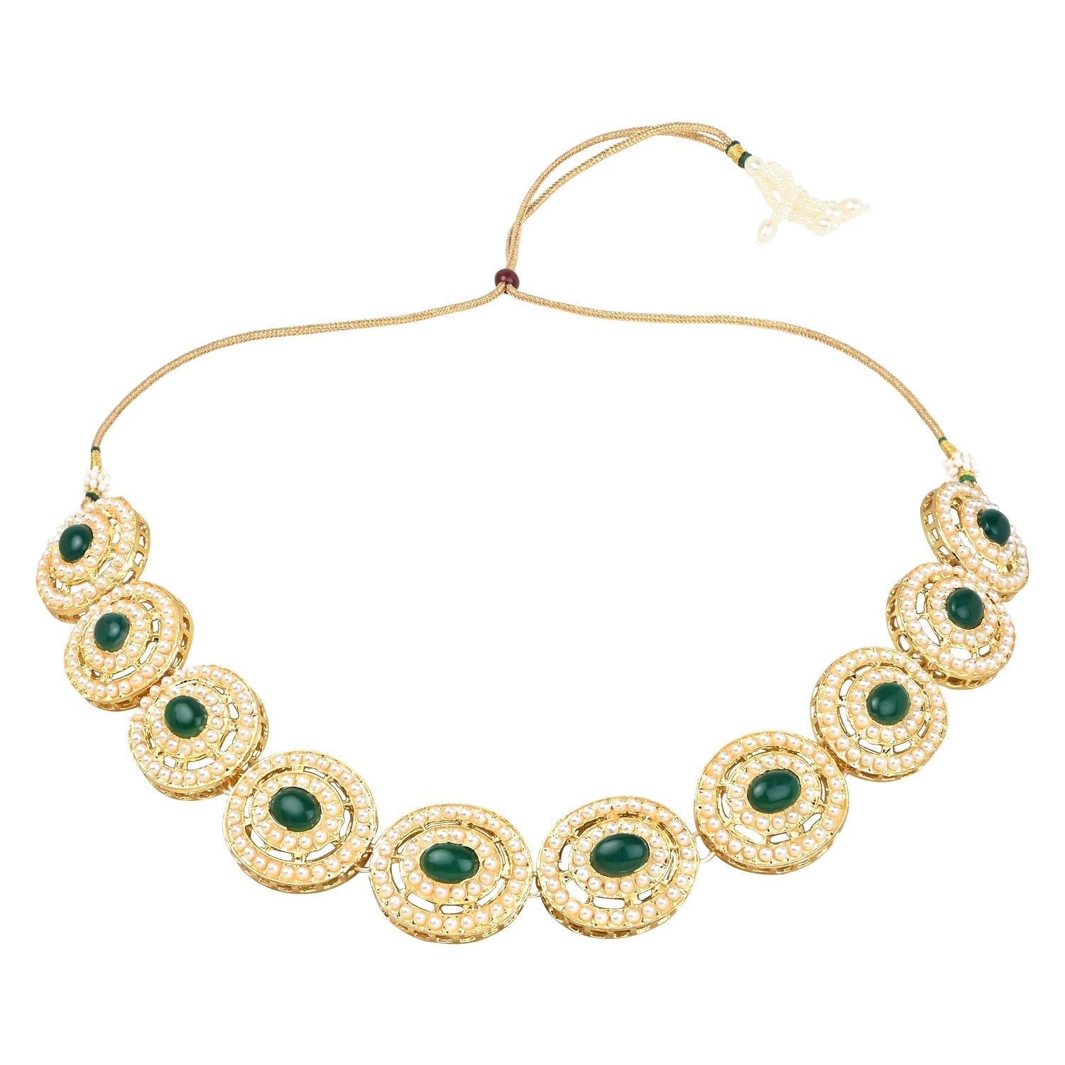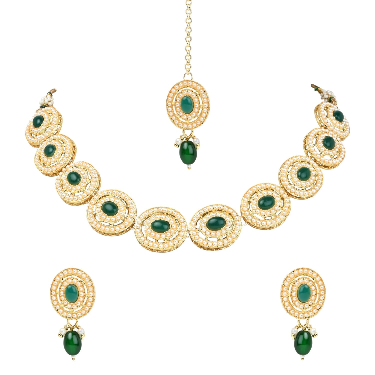 Elevate your traditional elegance with the gold plated traditional handcrafted pearl necklace set. This exquisite jewelry ensemble includes a necklace, matching earrings, and a maang tikka, all meticulously handcrafted with lustrous pearls. The set exudes a timeless charm that complements your ethnic and festive attire. Adorn yourself with the beauty of pearls, exuding grace and sophistication at every step. Make a lasting impression with this I Jewels jewelry set, a perfect accessory for women who appreciate classic Indian jewelry with a modern touch.