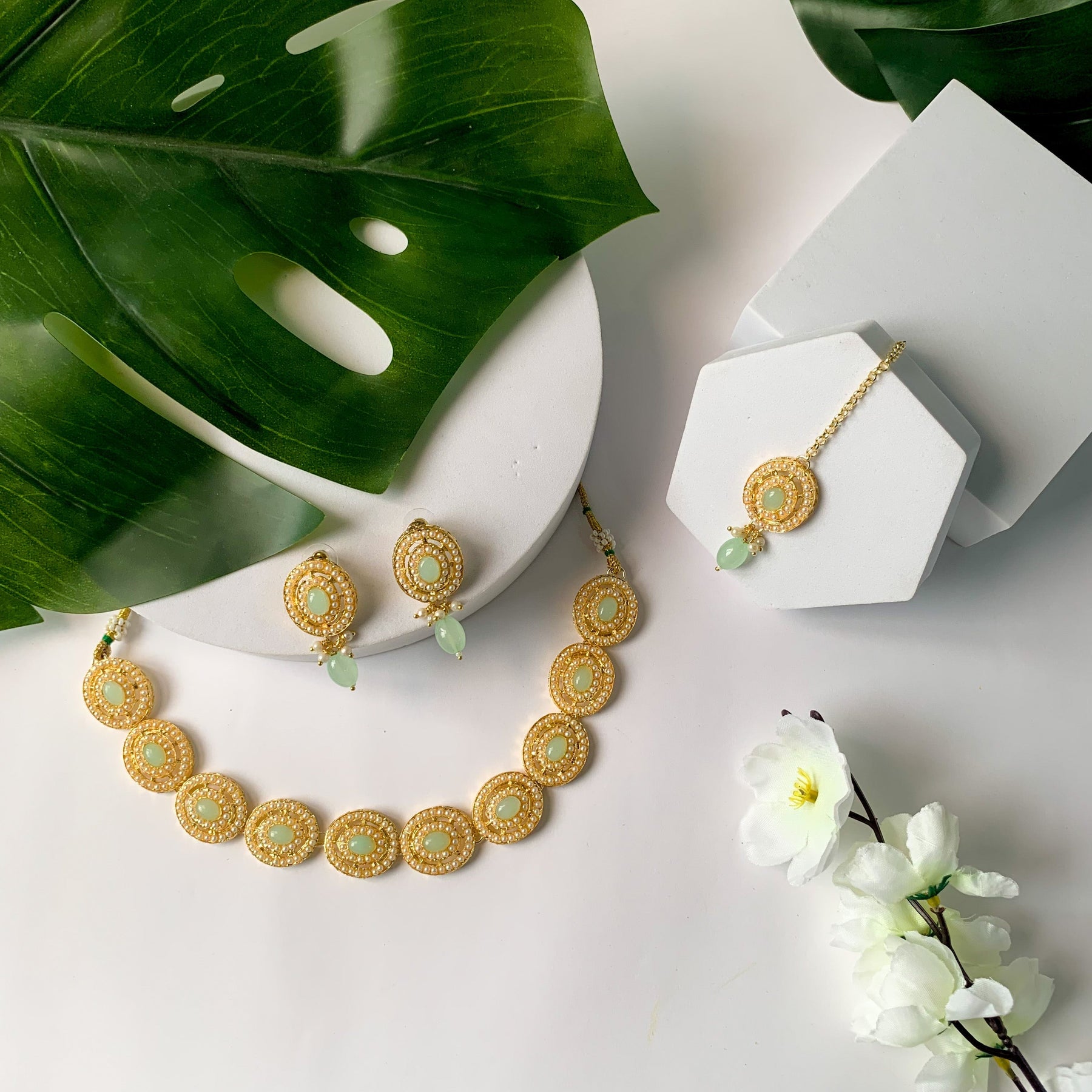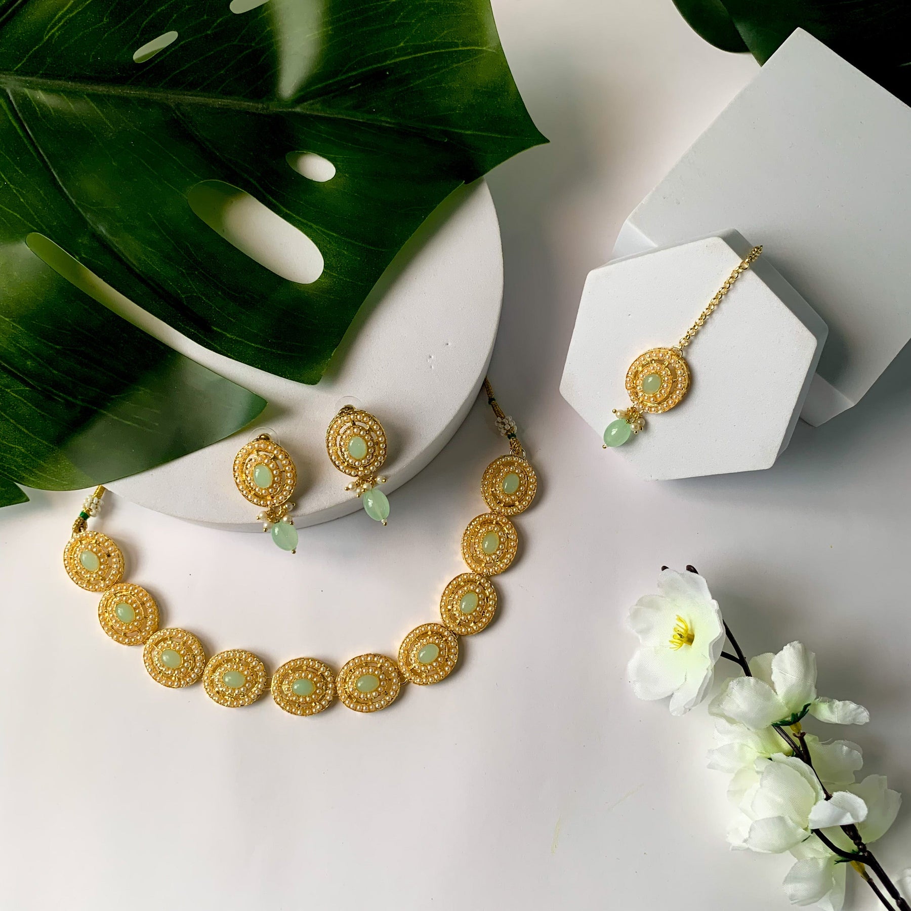 This set includes matching earrings and a Maang Tikka, each meticulously designed to harmonize with the necklace. Together, they create a harmonious and regal look. The Maang Tikka adds a touch of traditional charm, making it the perfect choice for weddings, festivals, and cultural ceremonies. Whether it's a wedding, festival, or a special gathering, this jewelry set is designed to make you stand out. Its timeless charm effortlessly elevates any outfit, making it the perfect choice for women and girls who appreciate both tradition and sophistication.