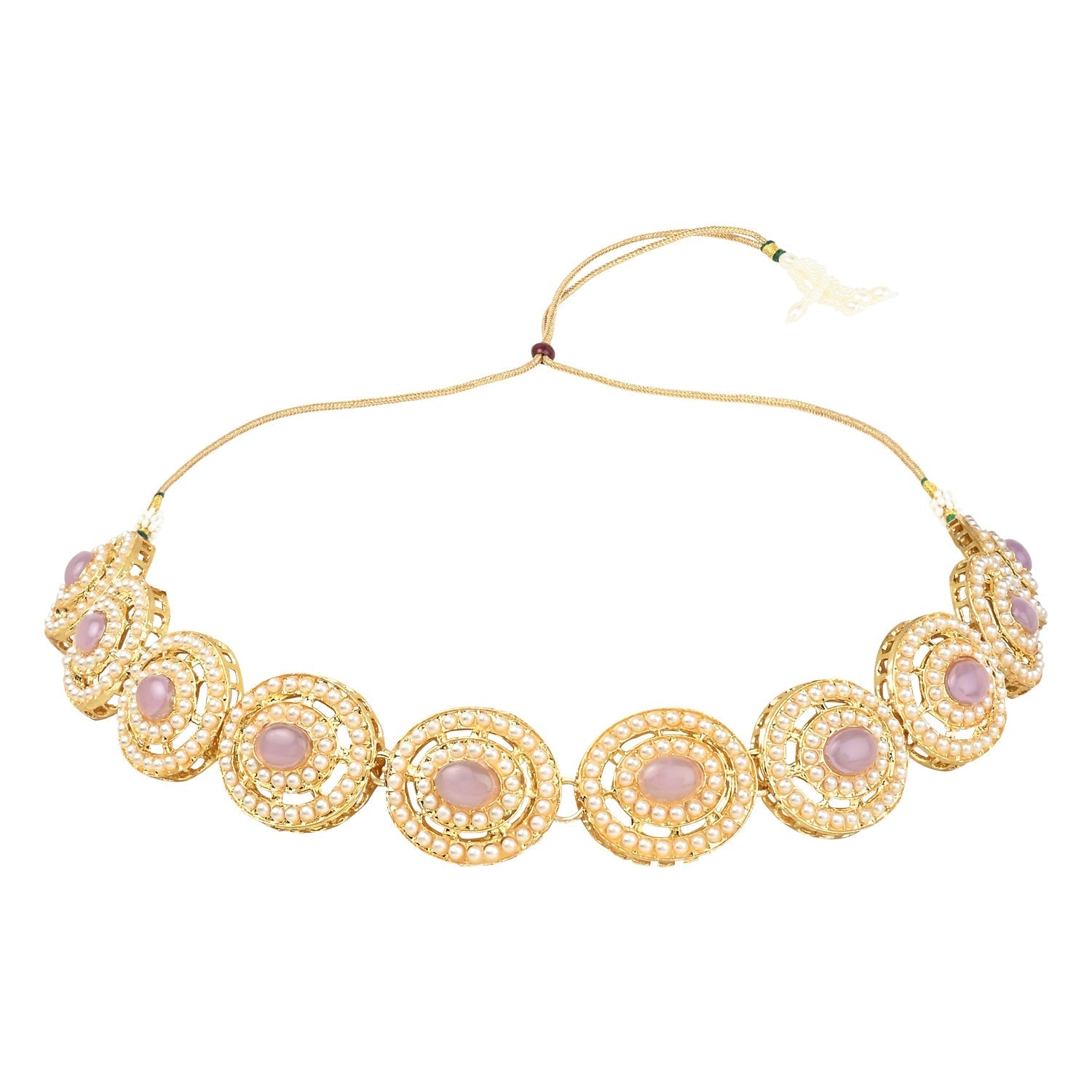 The gold-plated choker necklace set consists of a necklace, a pair of earrings, and a maang tikka. The necklace features kundan studded with pearl beaded in it, giving it an elegant and traditional look. The stones and pearls are set in a beautiful pattern, adding a touch of sophistication and grace to the necklace. The necklace is secured with drawstring closures, which make it easy to adjust the size to fit comfortably around the neck. This is an important feature, as it ensures that the necklace will be comfortable to wear for extended periods of time. The necklace is secured with drawstring closures, which make it easy to adjust the size to fit comfortably around the neck. This is an important feature, as it ensures that the necklace will be comfortable to wear for extended periods of time. The earrings and maang tikka are also adorned with stones and pearls, which match the pattern of the necklace. The earrings have a beautiful design, which makes them easy and comfortable to wear. The maang tikka is a traditional Indian hair accessory that can be worn with the necklace and earrings to complete the look.