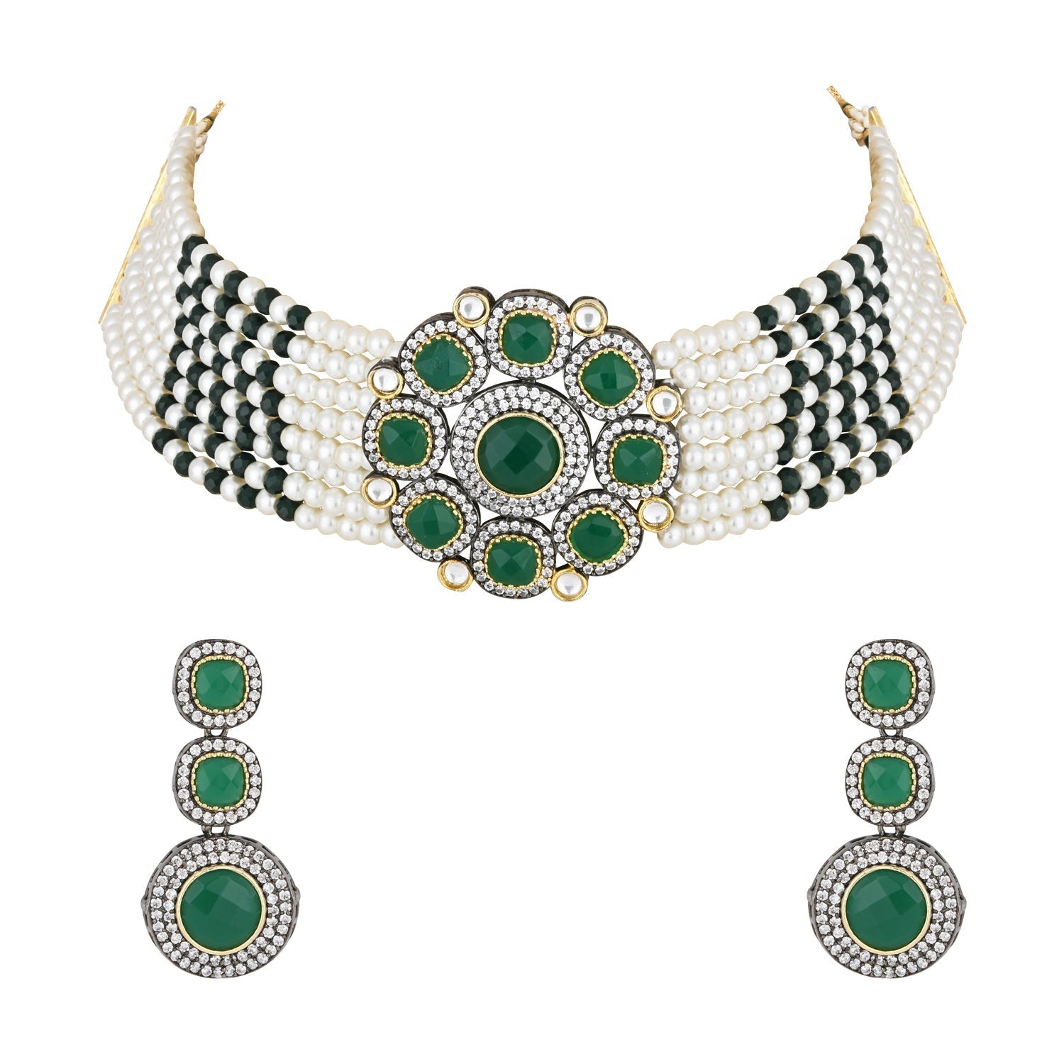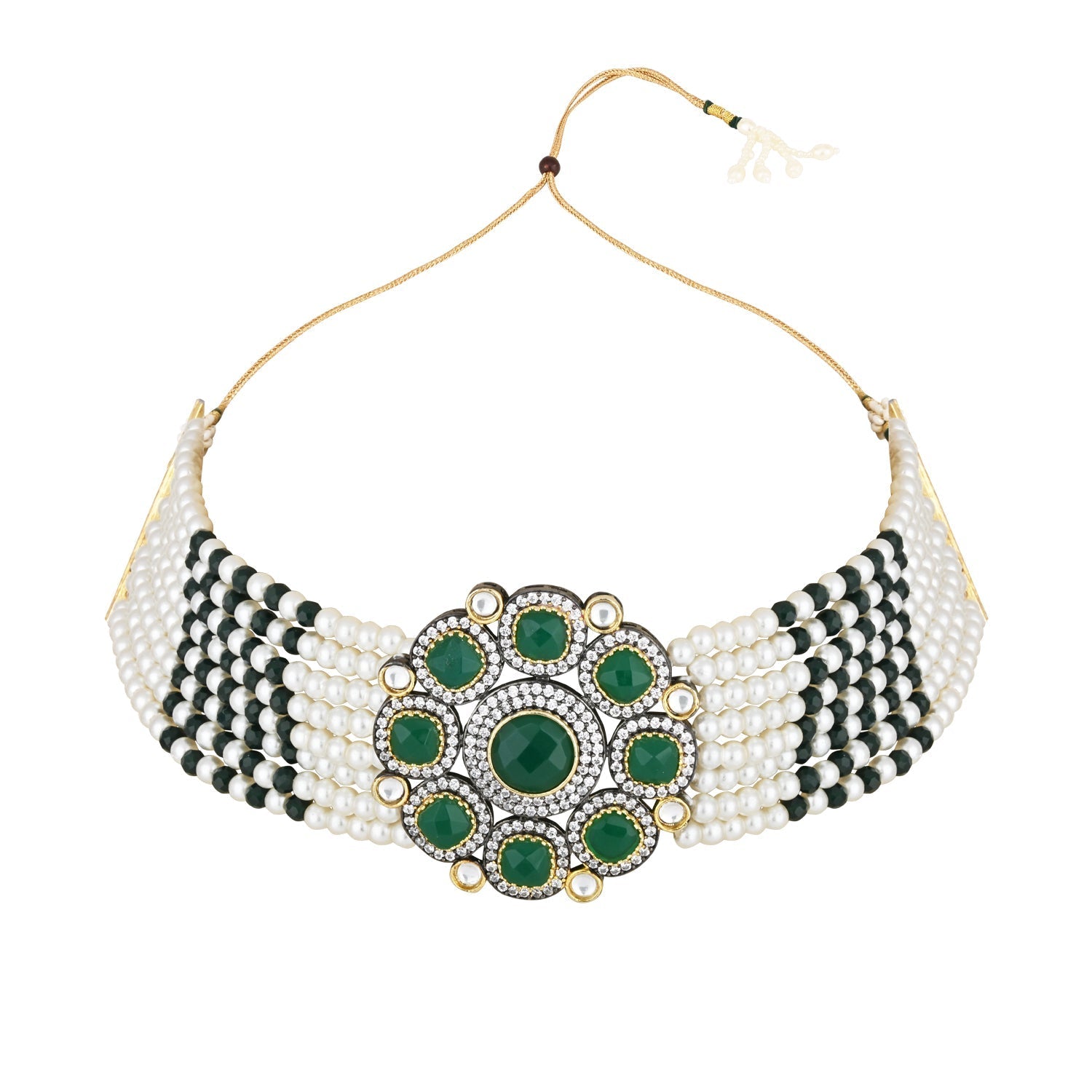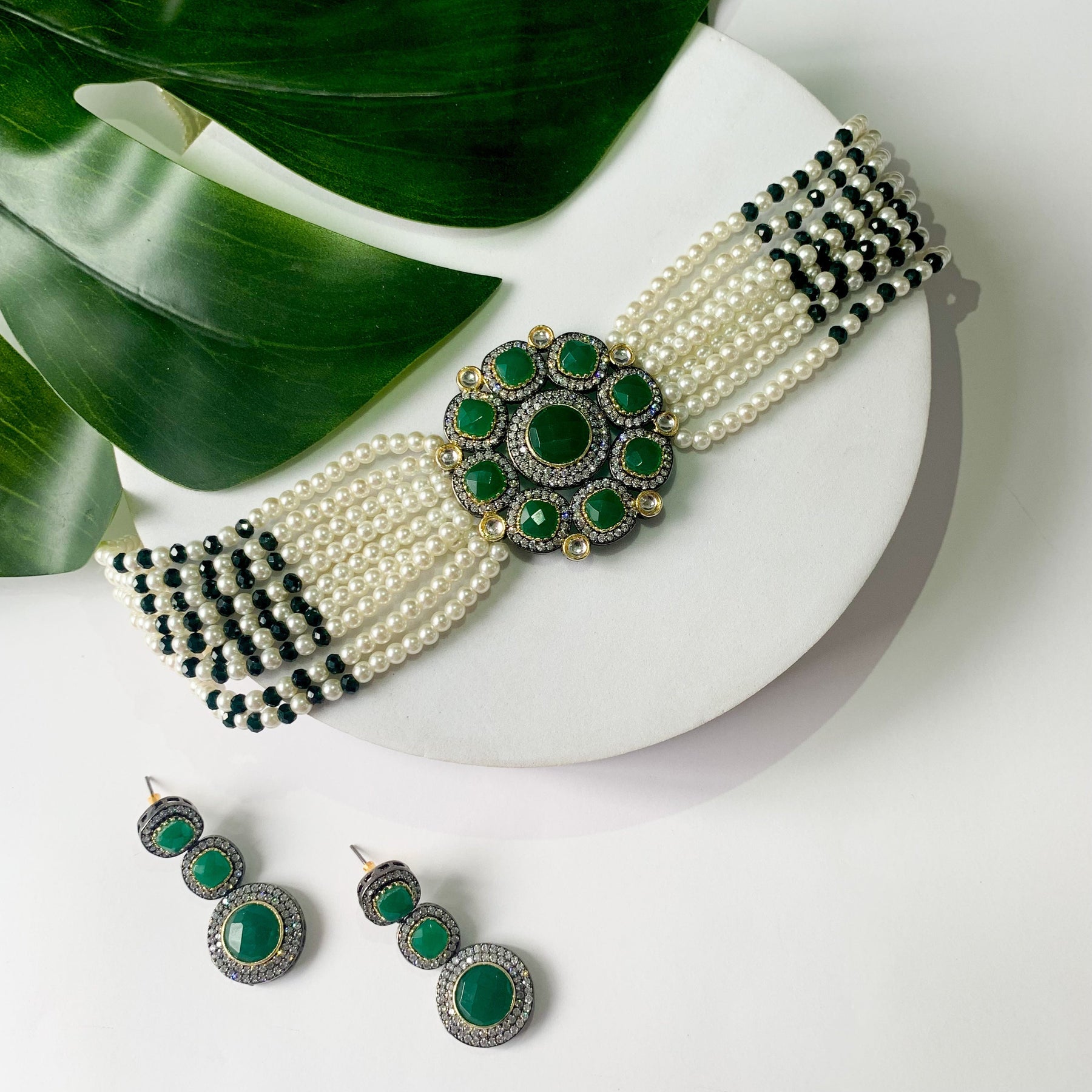 The Choker Necklace Set Consists Of A Necklace, A Pair Of Earrings. The Necklace Features Kundan Studded With Pearl Beaded In It, Giving It An Elegant And Traditional Look. The Stones And Pearls Are Set In A Beautiful Pattern, Adding A Touch Of Sophistication And Grace To The Necklace. The Necklace Is Secured With Drawstring Closures, Which Make It Easy To Adjust The Size To Fit Comfortably Around The Neck. This Is An Important Feature, As It Ensures That The Necklace Will Be Comfortable To Wear For Extended Periods Of Time. The Necklace Is Secured With Drawstring Closures, Which Make It Easy To Adjust The Size To Fit Comfortably Around The Neck. This Is An Important Feature, As It Ensures That The Necklace Will Be Comfortable To Wear For Extended Periods Of Time. The Earrings And Maang Tikka Are Also Adorned With Stones And Pearls, Which Match The Pattern Of The Necklace. The Earrings Have A Beautiful Design, Which Makes Them Easy And Comfortable To Wear. The Maang Tikka Is A Traditional Indian Hair Accessory That Can Be Worn With The Necklace And Earrings To Complete The Look.