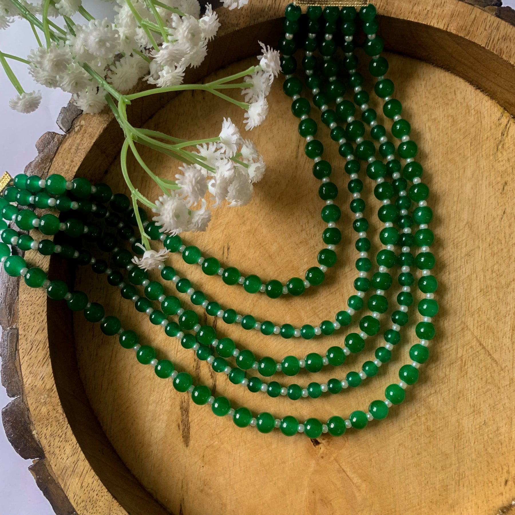 The gold-plated choker necklace set consists of a necklace. The necklace features kundan studded with pearl beaded in it, giving it an elegant and traditional look. The and pearls are set in a beautiful pattern, adding a touch of sophistication and grace to the necklace. The necklace is secured with drawstring closures, which make it easy to adjust the size to fit comfortably around the neck. This is an important feature, as it ensures that the necklace will be comfortable to wear for extended periods of time. The necklace is secured with drawstring closures, which make it easy to adjust the size to fit comfortably around the neck. This is an important feature, as it ensures that the necklace will be comfortable to wear for extended periods of time. The earrings and maang tikka are also adorned with stones and pearls, which match the pattern of the necklace. The earrings have a beautiful design, which makes them easy and comfortable to wear. The maang tikka is a traditional Indian hair accessory that can be worn with the necklace and earrings to complete the look.