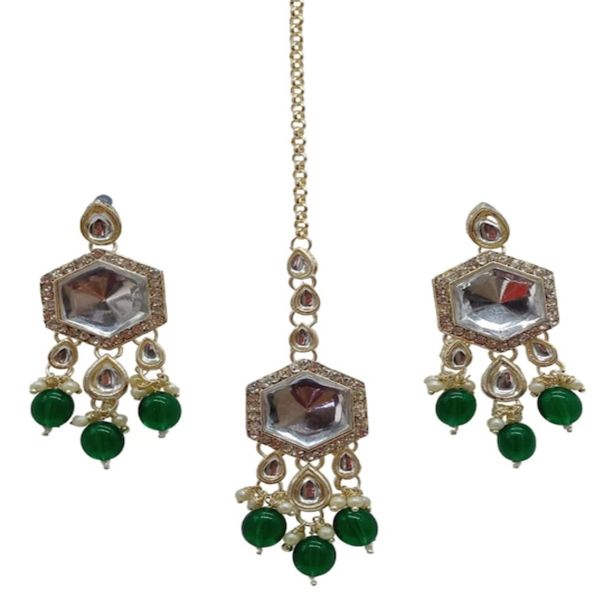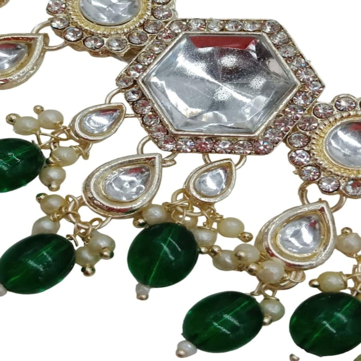 The Necklace Features A Series Of Hexagonal Clear Stones Surrounded By Smaller White Stones, Creating A Dazzling Effect. Delicate Pearl-Like Beads And Vibrant Green Droplets Hang From The Main Design, Adding Movement And Color. The Matching Earrings Echo This Exquisite Pattern, While The Tikka Completes The Set With A Single Hexagonal Stone And Hanging Green Beads.
