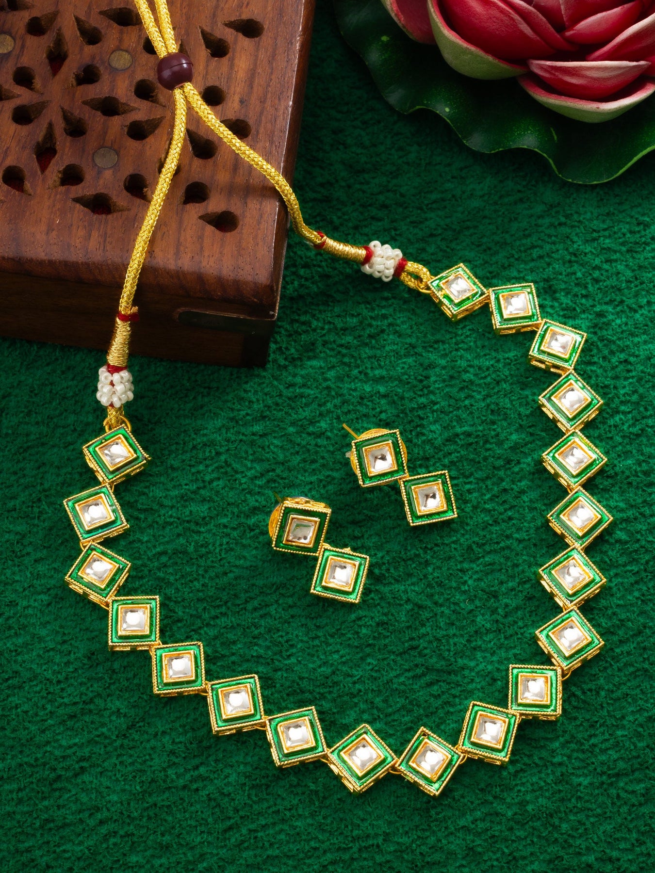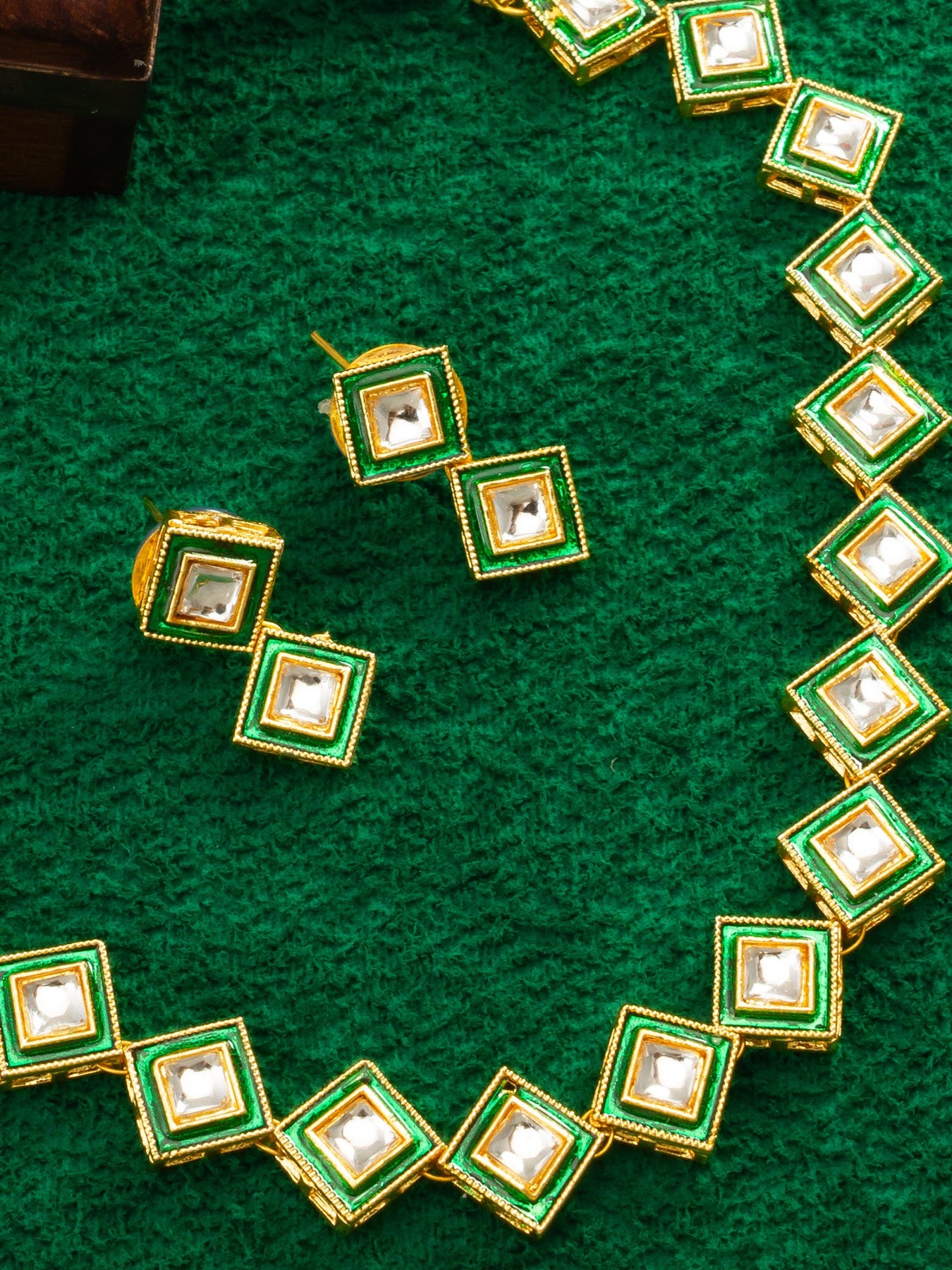 This Exquisite Jewelry Ensemble Features A Harmonious Blend Of Rich Green Hues And Radiant Gold Accents, Making It The Perfect Accessory For Any Occasion. Crafted With Meticulous Attention To Detail, The Necklace Drapes Beautifully Around The Neckline, While The Matching Earrings Add A Touch Of Sophistication To Your Look. Whether You'Re Dressing Up For A Special Event Or Adding Flair To Your Everyday Attire, This Set Is Sure To Turn Heads And Make A Lasting Impression.