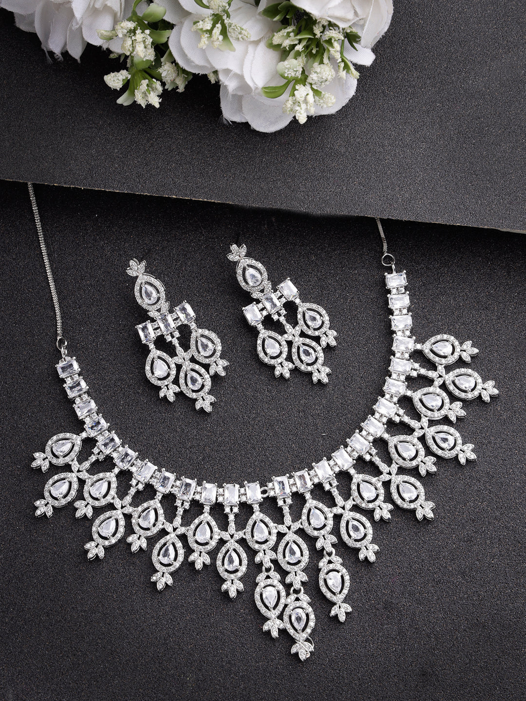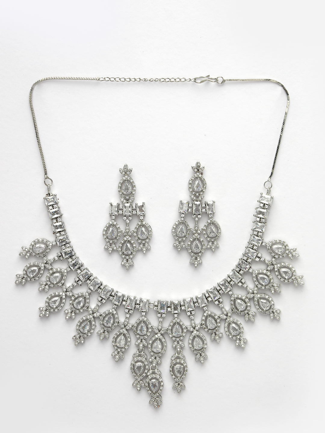 Style Note: The NVR Women Silver-Plated Cubic Zirconia Studded Handcrafted Jewellery Set offers a sophisticated and elegant addition to any ensemble. Its silver-plated design exudes timeless charm, while the cubic zirconia stones add a touch of sparkle and luxury.Perfect for special occasions or adding a touch of glamour to your everyday look, let this handcrafted jewellery set become your signature accessory. Embrace the beauty of craftsmanship and elevate your style with this timeless treasure.