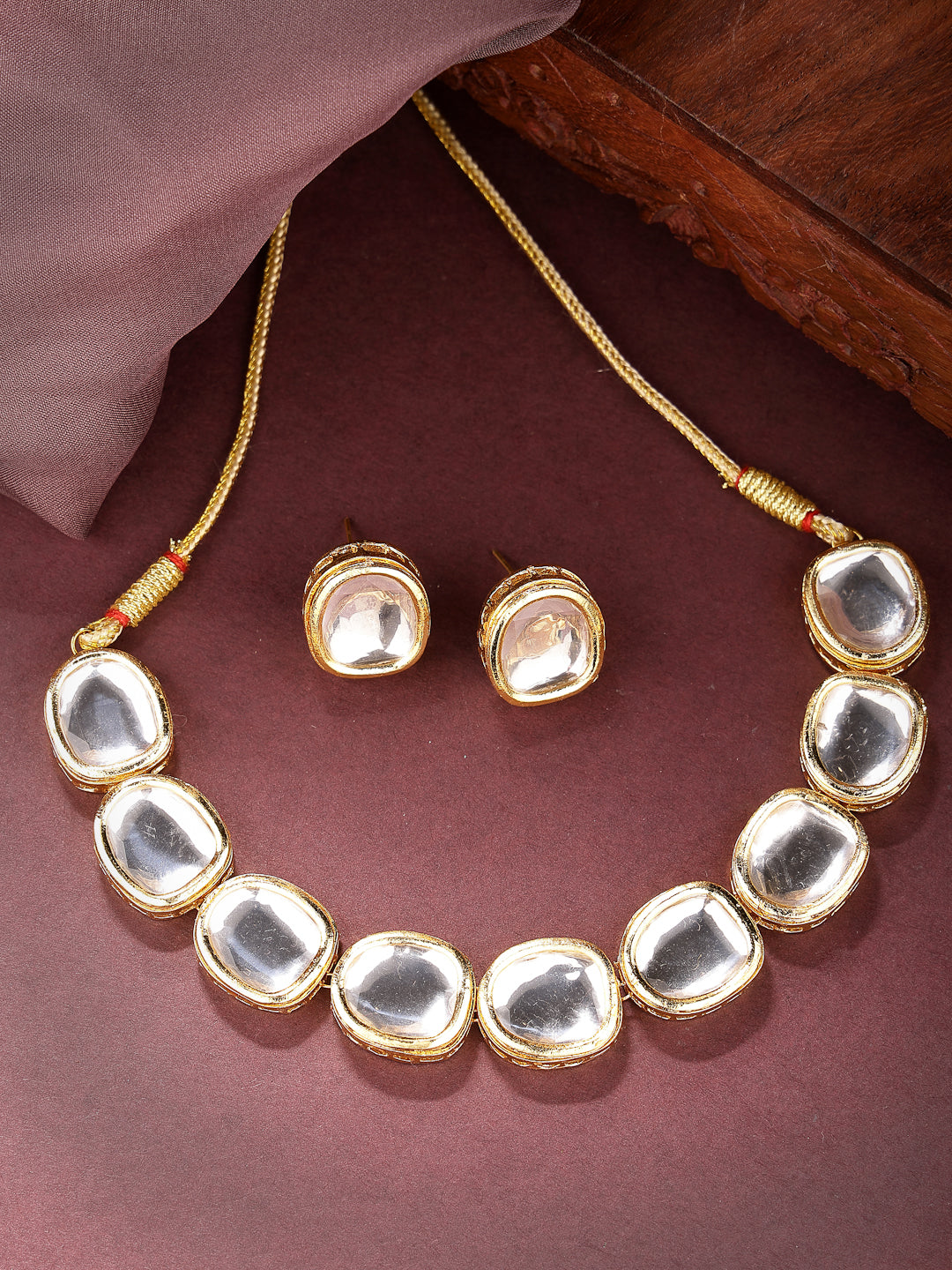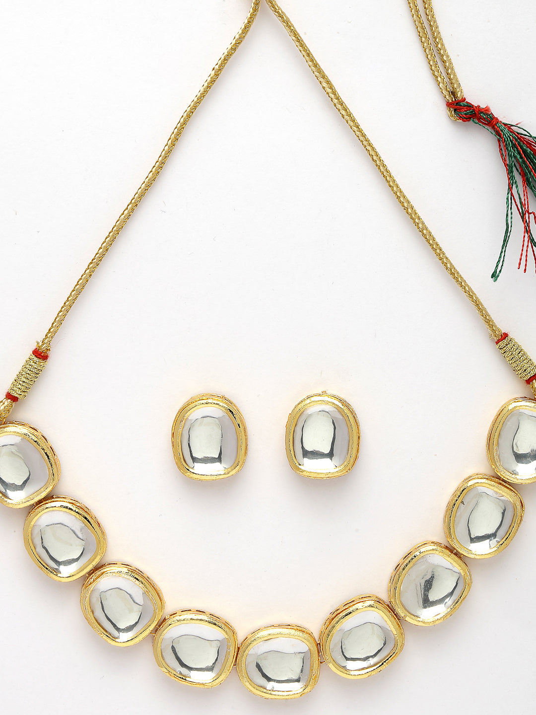 Style Note: Enhance your ensemble with the timeless elegance of the NVR Women Gold-Plated & White Kundan-Studded Handcrafted Jewellery Set. Featuring delicate white Kundan stones and a gold-plated finish, this set exudes sophistication and grace. Perfect for weddings, formal receptions, or cultural events, this handcrafted jewellery set adds a touch of traditional charm to your look, ensuring you stand out with refined elegance and poise.
