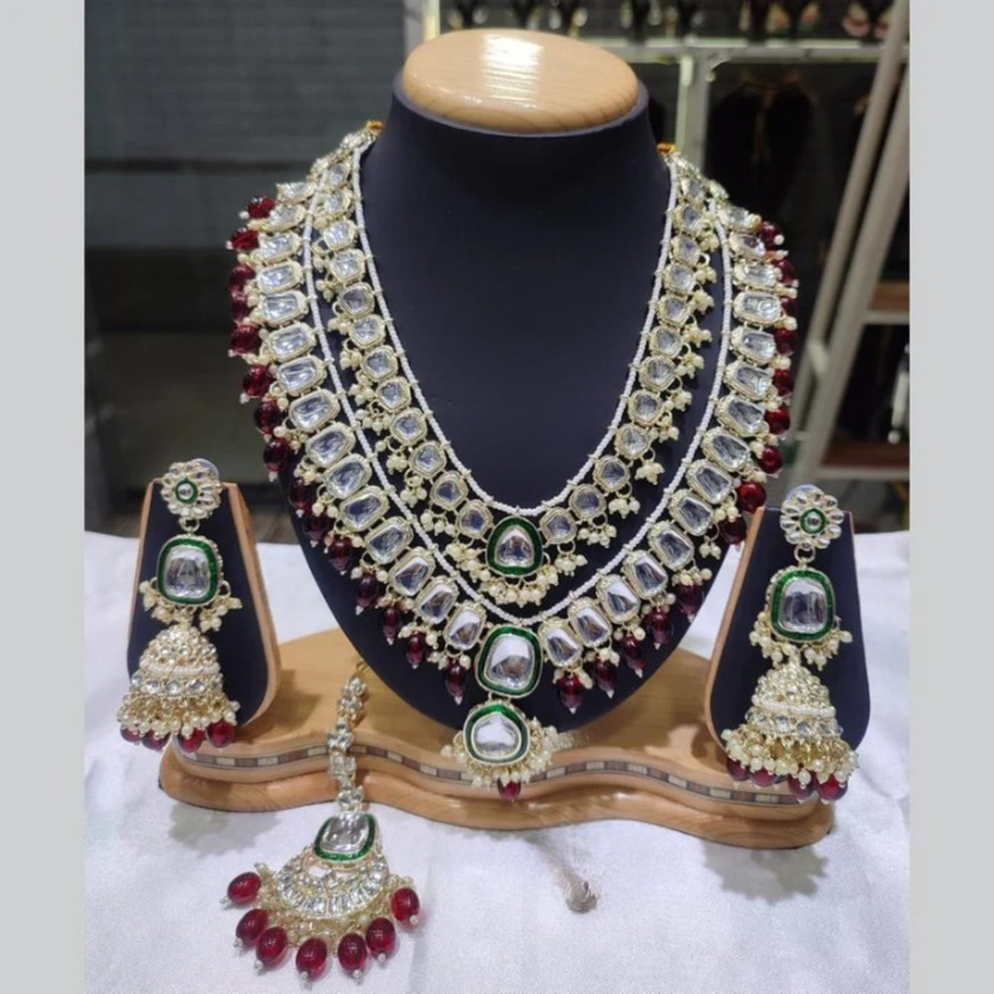 The Set Includes Matching Statement Earrings With Emerald-Colored Centerpieces Surrounded By Intricately Placed Polki And Cascading Pearl Clusters. Each Piece Demonstrates Exceptional Craftsmanship Through: