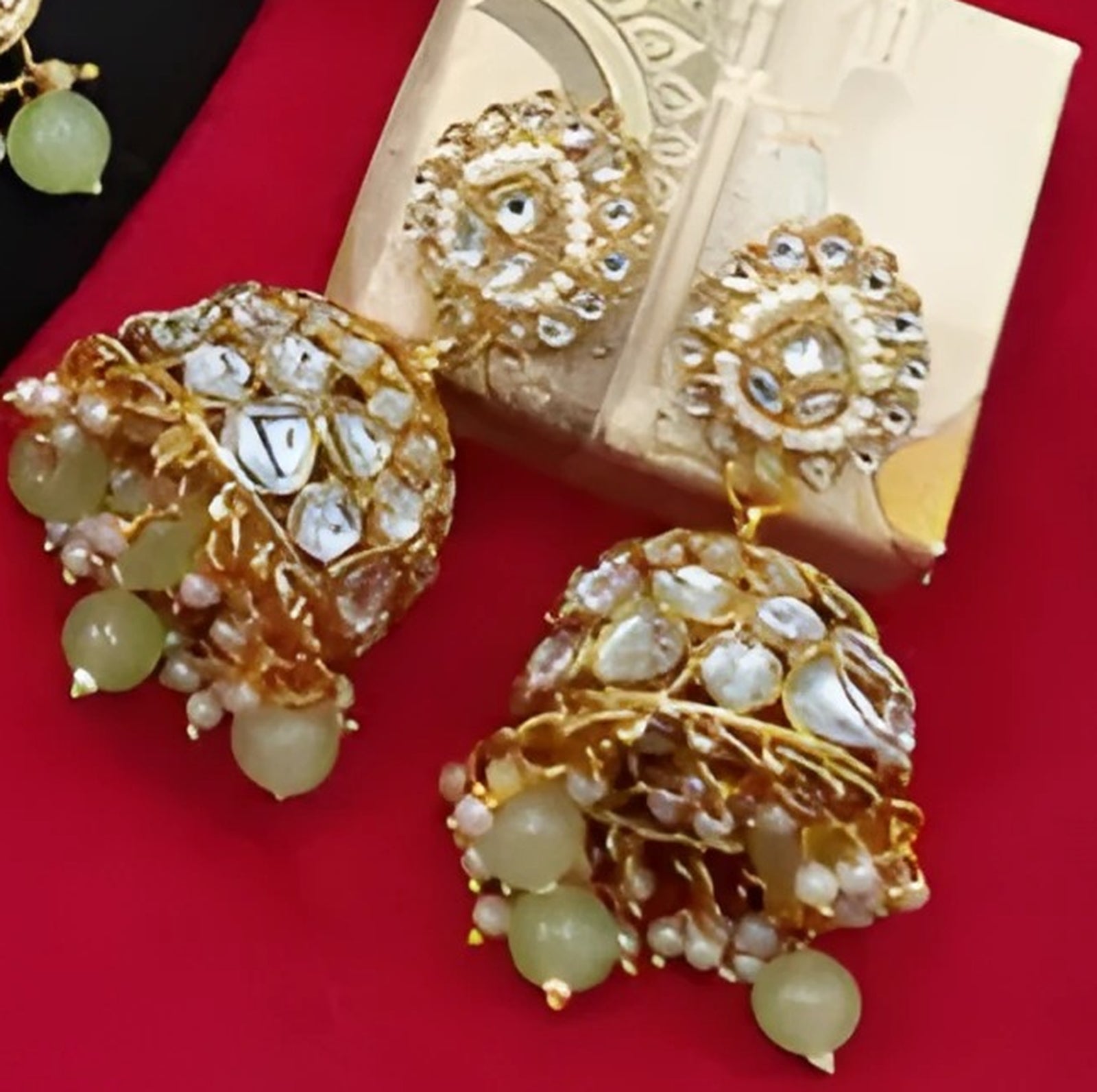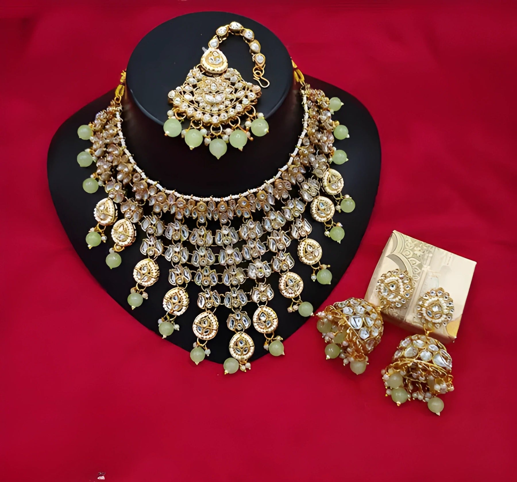 Each Piece Is Meticulously Handcrafted With Gold-Plated Metal, Premium Kundan Stonework, And Vibrant Mint-Colored Accents That Catch The Light With Every Movement. The Combination Of White Stones Against The Rich Gold Setting Creates A Timeless Elegance Perfect For Wedding Ceremonies, Engagement Parties, And Cultural Festivals.