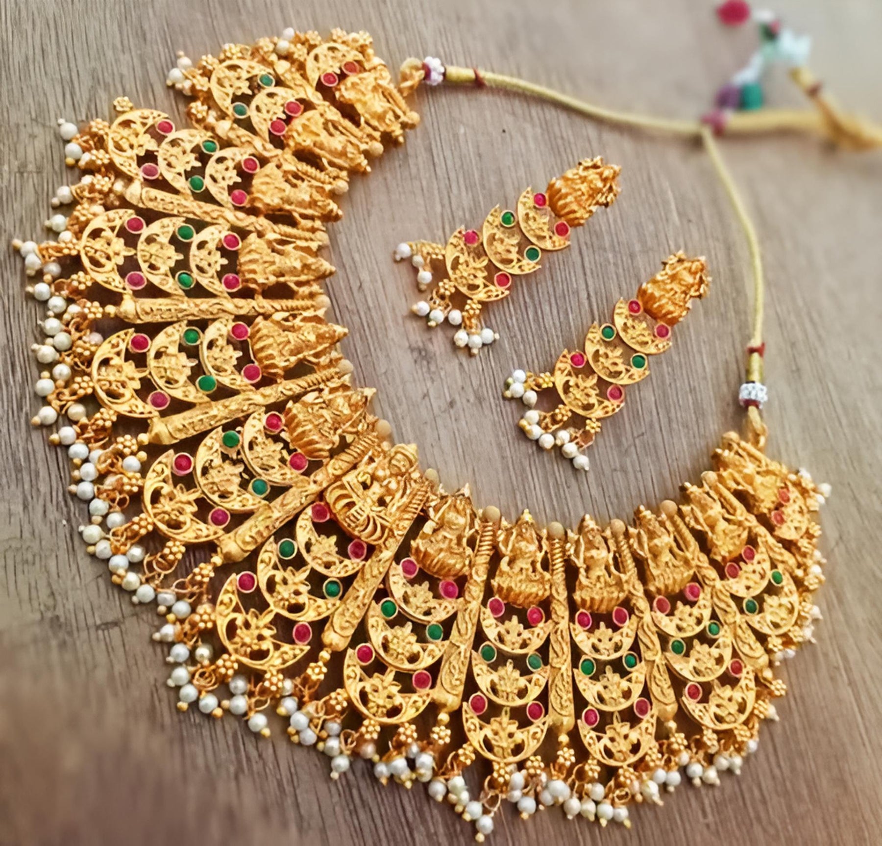This Exquisite Gold-Plated Jewelry Set Features An Intricate, Filigree Chandelier Necklace Adorned With Vibrant Gemstones. The Matching Earrings Complete The Elegant, Traditional Look. Crafted With Meticulous Detail, This Handmade Set Is Perfect For Formal Occasions, Weddings, And Festivals. The Ornate Design Effortlessly Complements Ethnic And Modern Attire Alike.