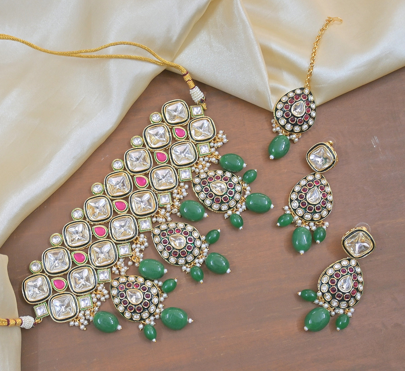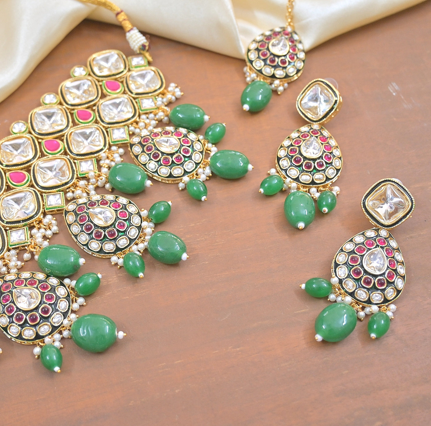 - Adorned With Kundan Stones, Small Pearls, And Green Onyx Drops