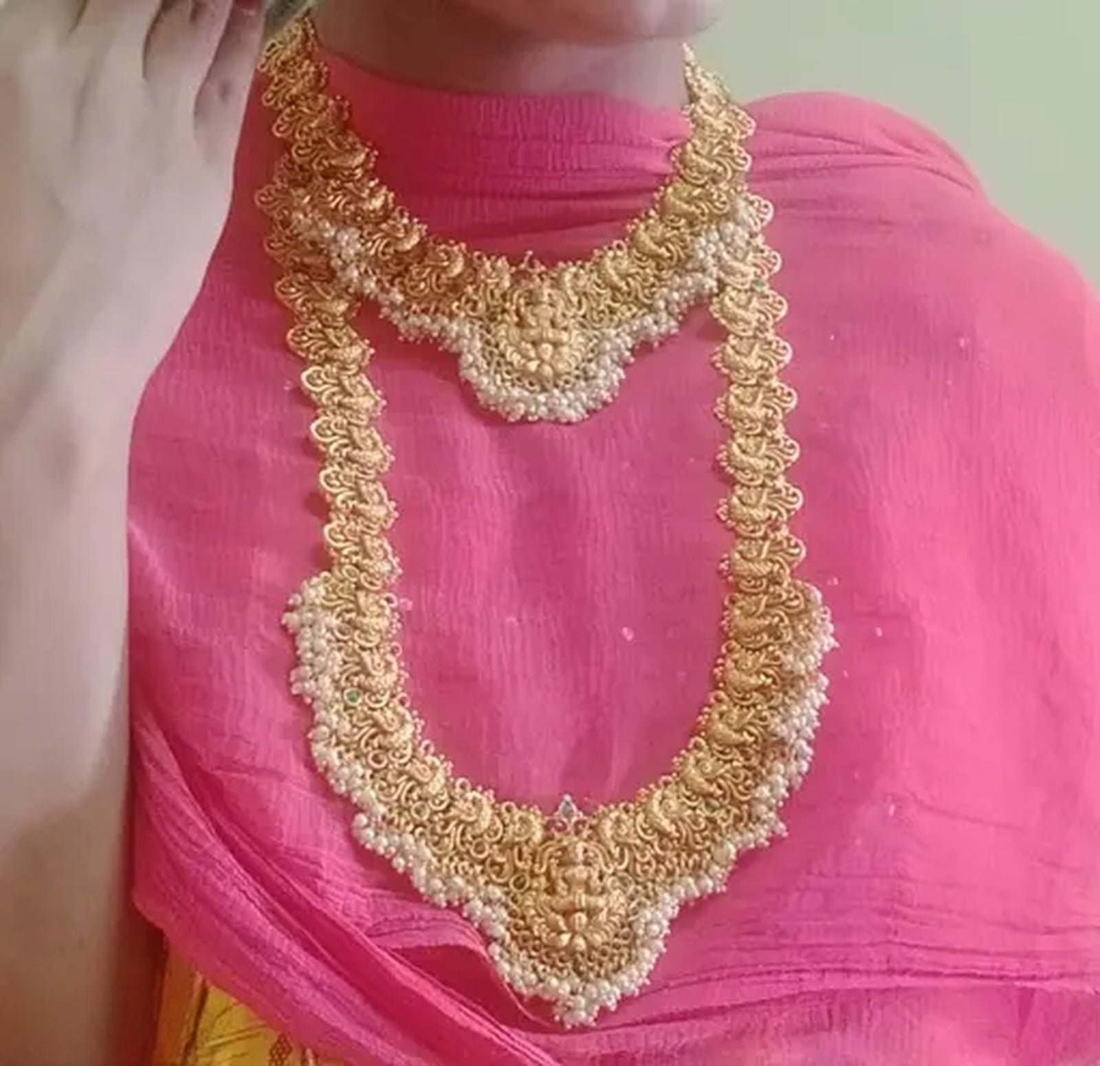 1. A Stunning Short Necklace Featuring Intricate Lakshmi Motifs