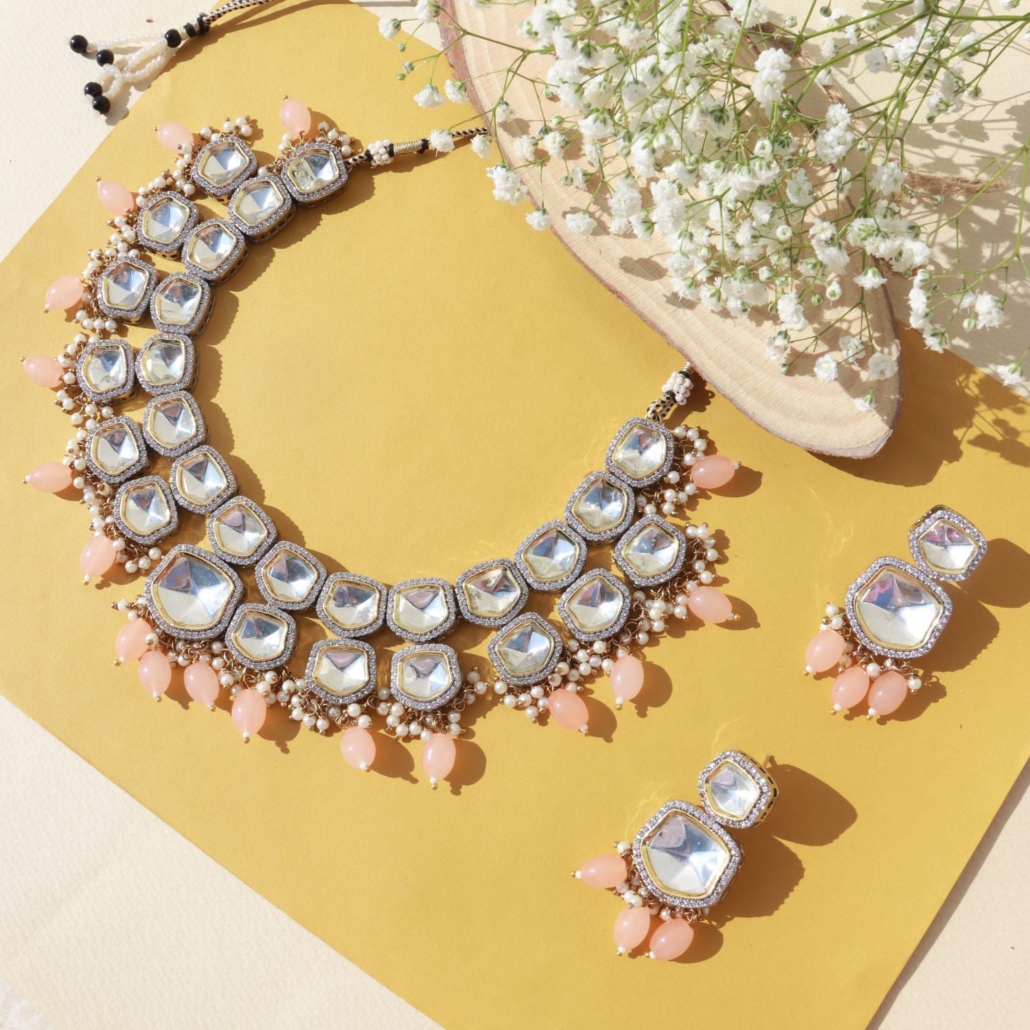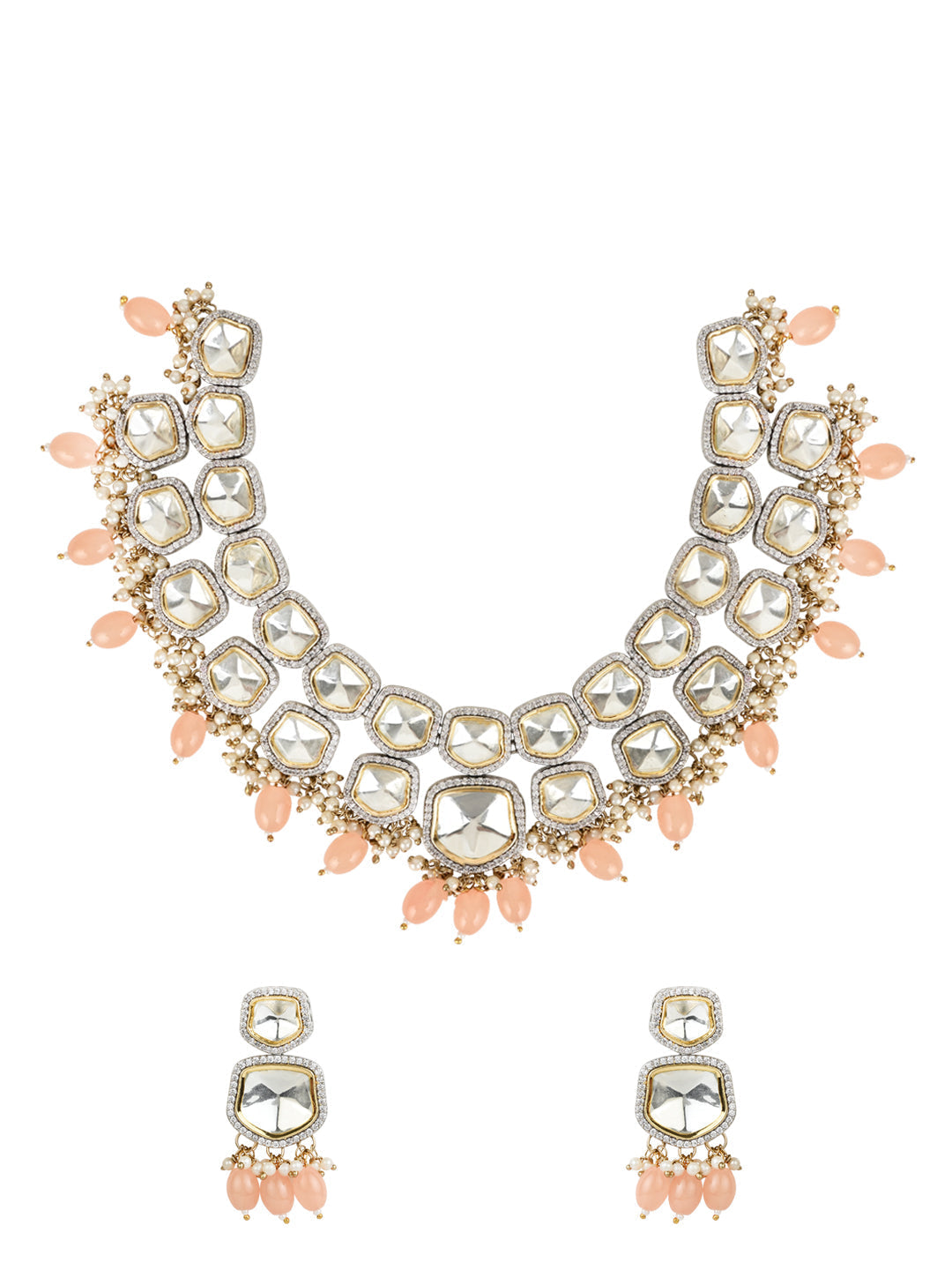 This Brass Jewellery Set Inspired From Real Jewellery Designs Is Crafted In 24K Gold Plating And Consists Of A Necklace And A Pair Of Earrings.This Captivating Indian Jewellery Set Is A Great Gifting Option And Is A Perfect Pick To Add To Your Jewelry Collection. You Can Style It With Ethnic Or Western Clothing.