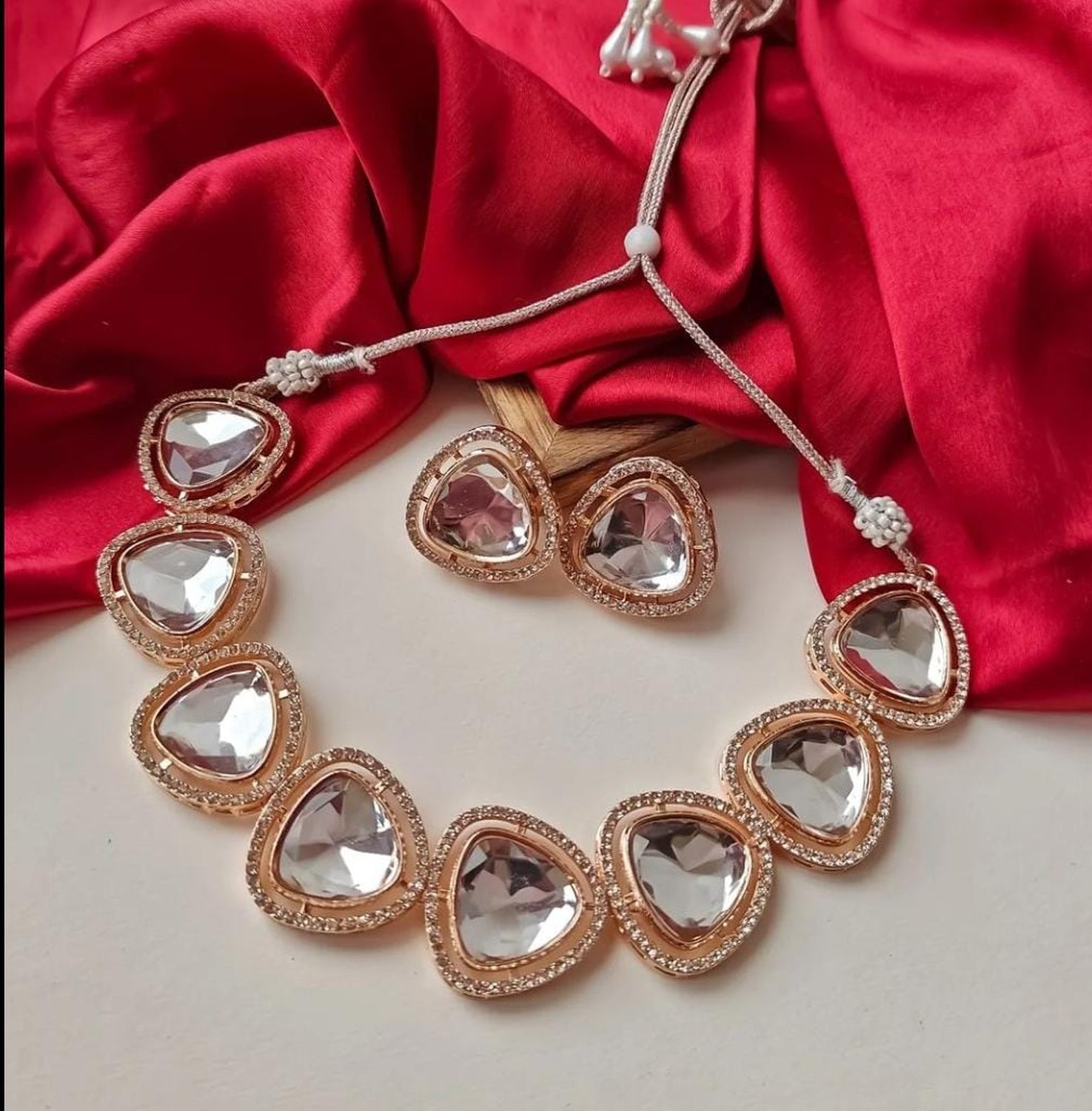 Embrace Romance And Elegance With This Stunning Rose Gold Crystal Necklace Set Featuring Heart-Shaped Crystals In A Contemporary Design. This Modern Statement Piece Combines Sophistication With Glamour, Perfect For Special Occasions And Bridal Wear.