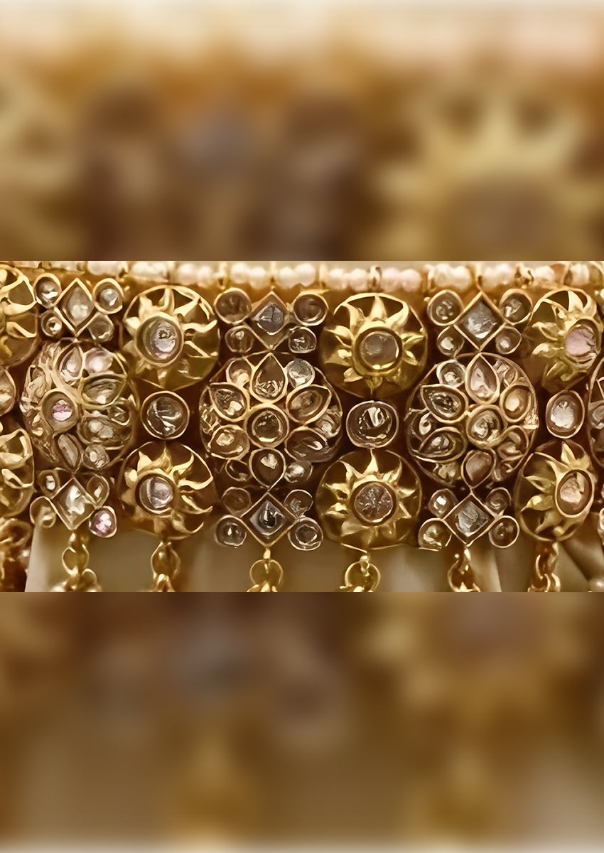 The Set Showcases A Harmonious Blend Of Gold-Toned Metal Work And Glistening Kundan Stones, Creating A Regal Aesthetic Perfect For Your Special Day. The Choker'S Elaborate Pattern Is Punctuated By Dangling Pearl Drops, Adding Movement And Grace To The Design.