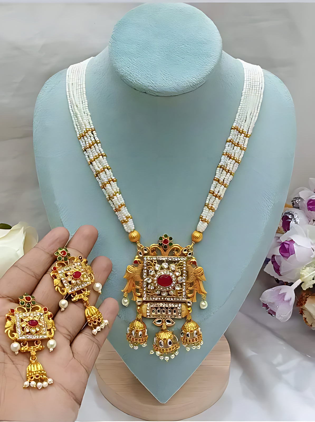 Women's Elegant White Pearl And Gold Kundan Necklace Set With Ornate Pendant
