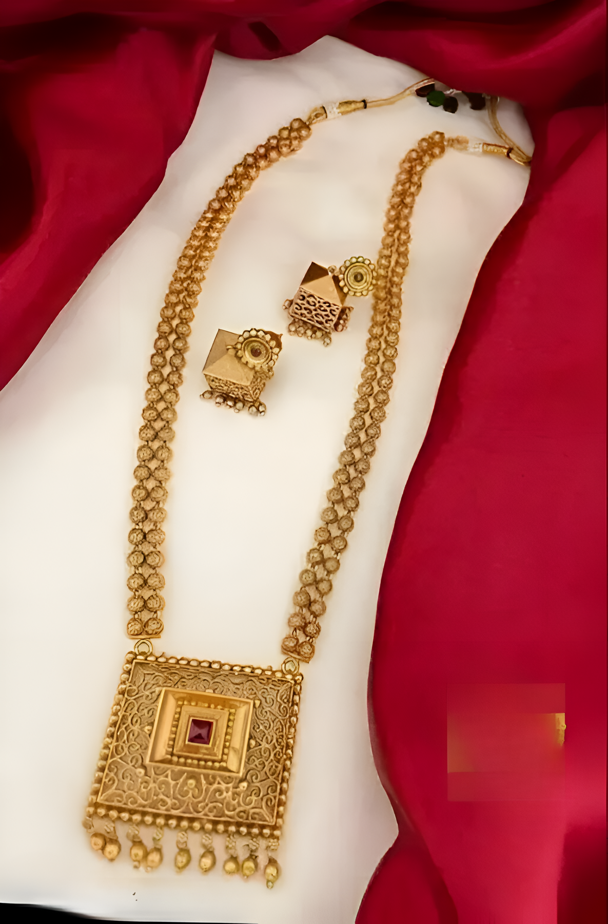 Antique Gold-Plated Filigree Necklace Set – Traditional Long Haram With Ruby Accent