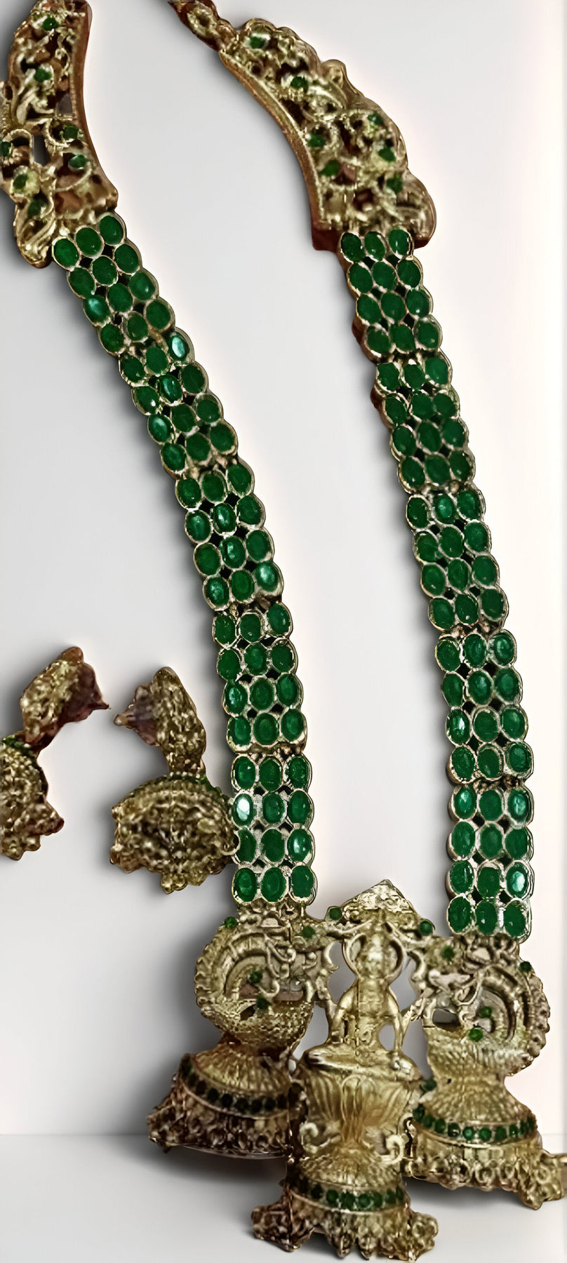 Elevate Your Ethnic Ensemble With This Stunning Handcrafted Temple Jewelry Set Featuring An Intricately Designed Goddess Lakshmi Pendant. This Traditional South Indian-Inspired Necklace Set Combines The Timeless Appeal Of Antique Gold Finishing With Vibrant Green Stone Embellishments For A Perfect Balance Of Elegance And Cultural Significance.