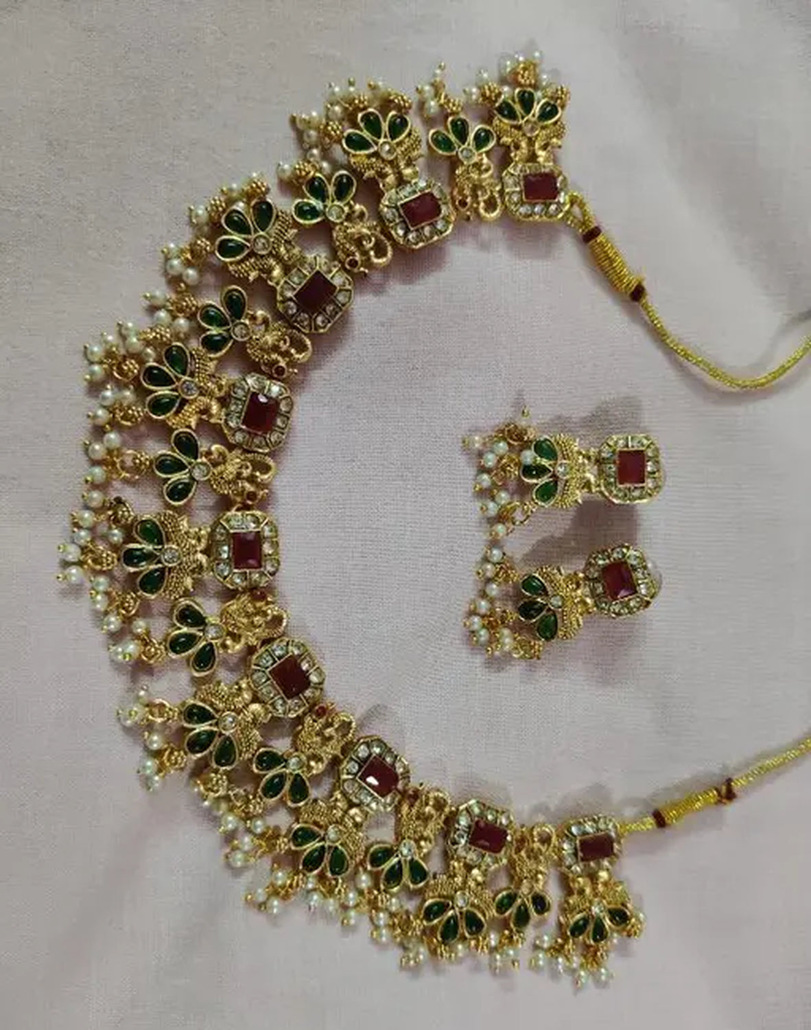Meticulously Crafted By Skilled Artisans, This Set Showcases The Timeless Beauty Of Traditional Indian Craftsmanship With Intricate Gold-Plated Detailing And Precise Stonework. The Alternating Pattern Of Square Multi Stones And Teardrop Green Emeralds Creates A Visually Striking Contrast, While The Delicate Pearl Clusters Add A Soft, Romantic Touch To The Bold Design.
