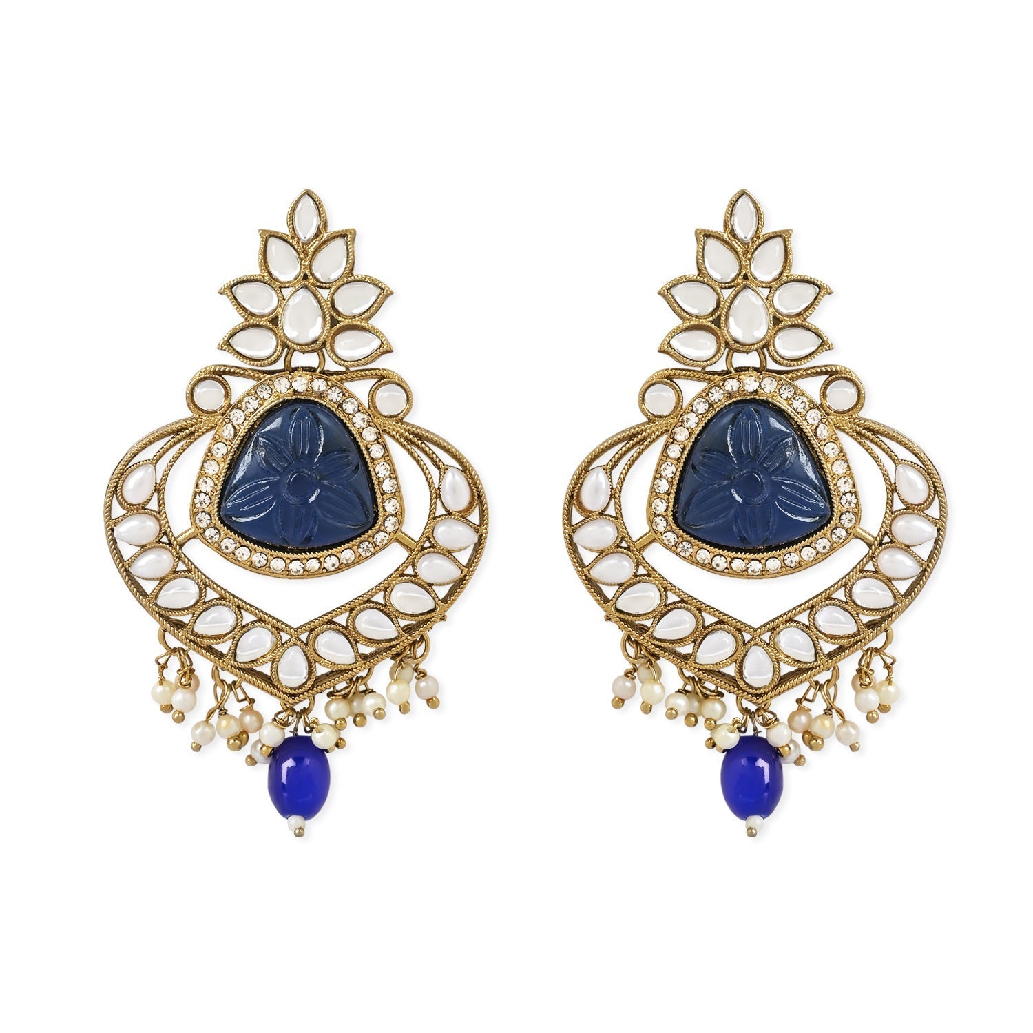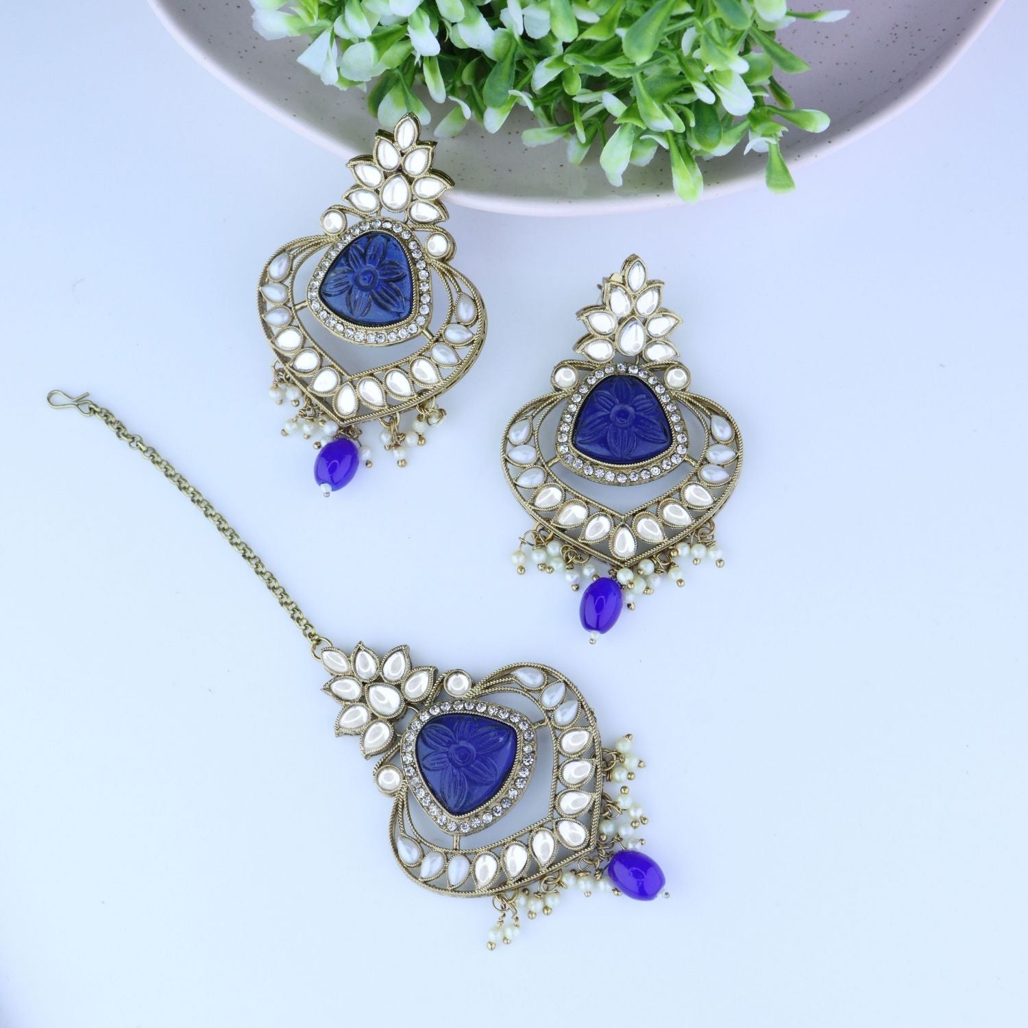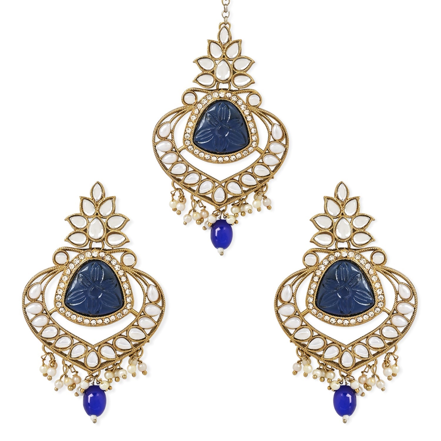 A Beautiful Set Of Jewelry That Will Add Elegance And Grace To Any Traditional Attire.These Chandbali Earrings Are Gold Plated And Adorned With Shimmering Kundan Stones That Sparkle In The Light. The Earrings Feature Traditional Pearl Hangings That Add A Touch Of Sophistication To The Design. Accompanying The Earrings Is A Matching Maang Tikka, Which Is Studded With Kundan Stones And Pearls. The Maang Tikka Beautifully Complements The Earrings And Adds A Touch Of Glamour To Any Hairstyle.This Jewelry Set Is Perfect For Weddings, Festivals, And Other Traditional Occasions. It Also Makes A Great Gift For Any Special Woman Or Girl In Your Life.
