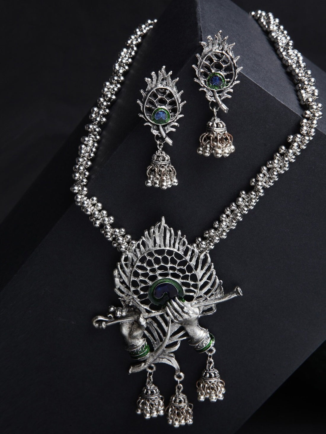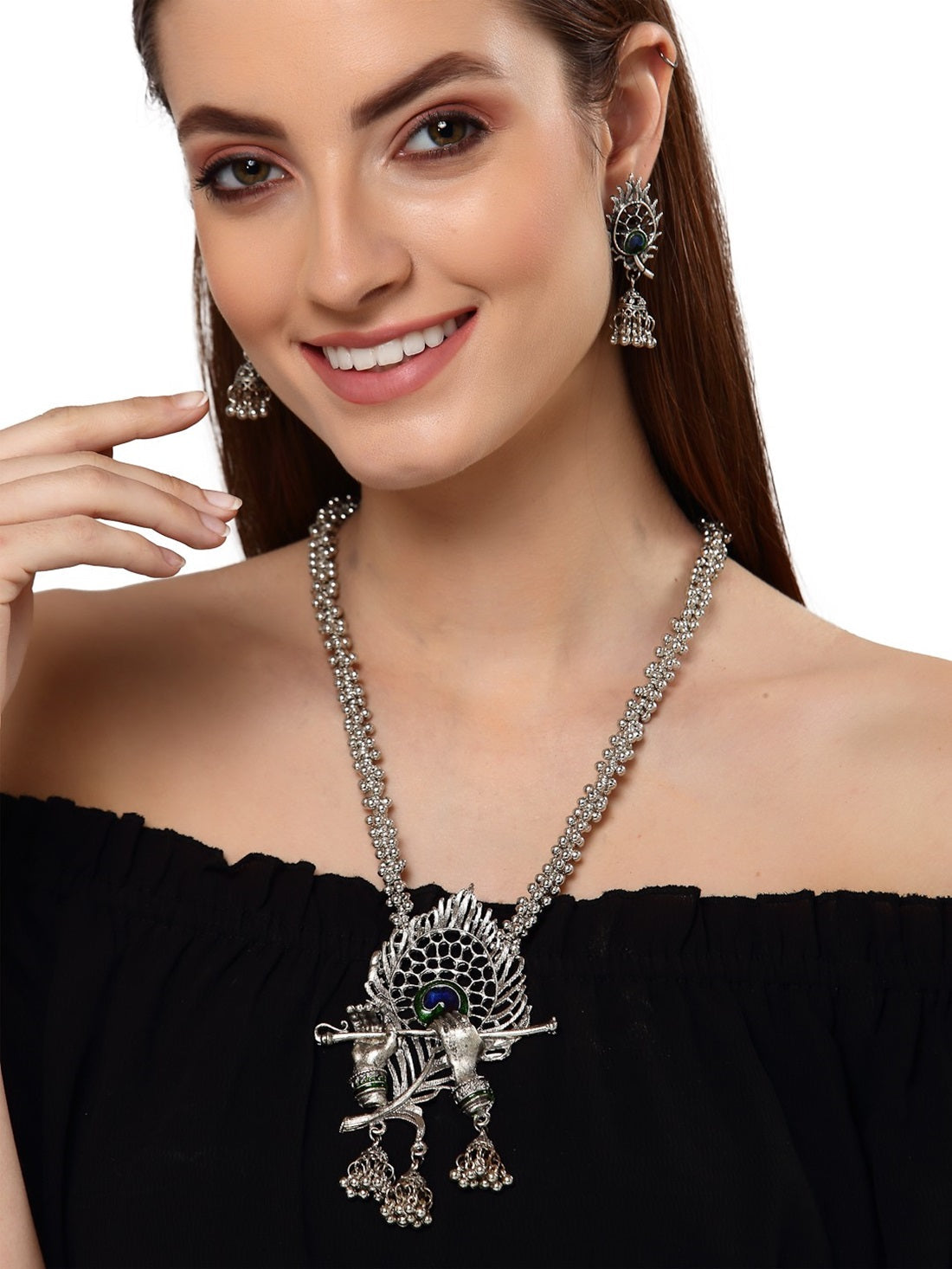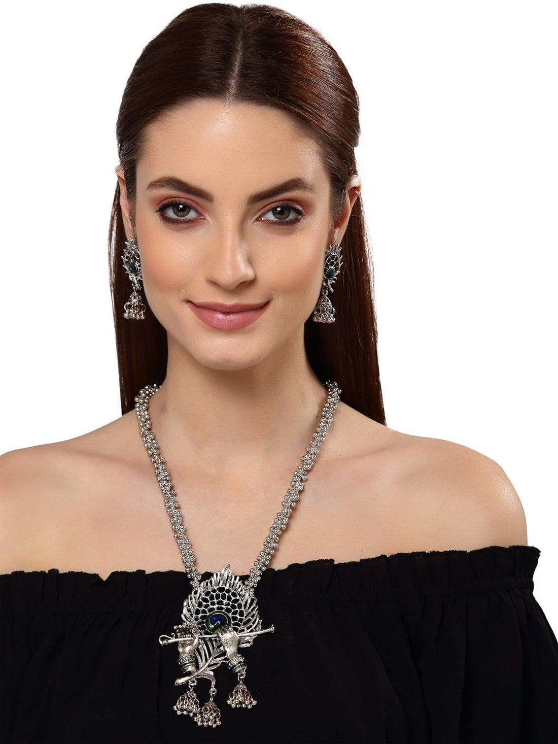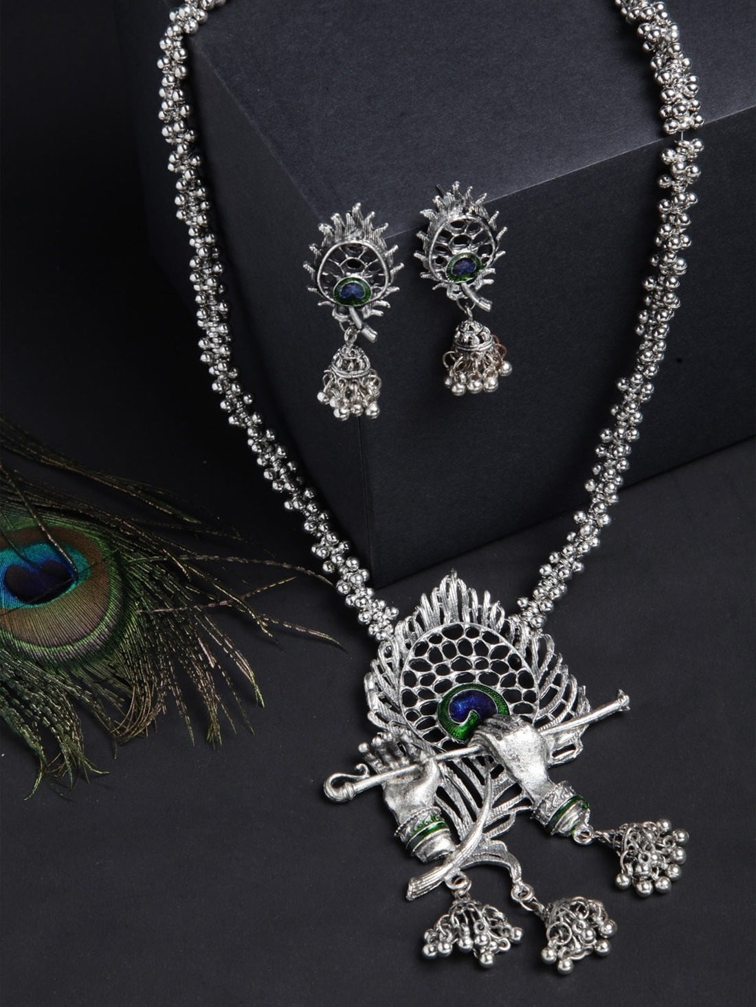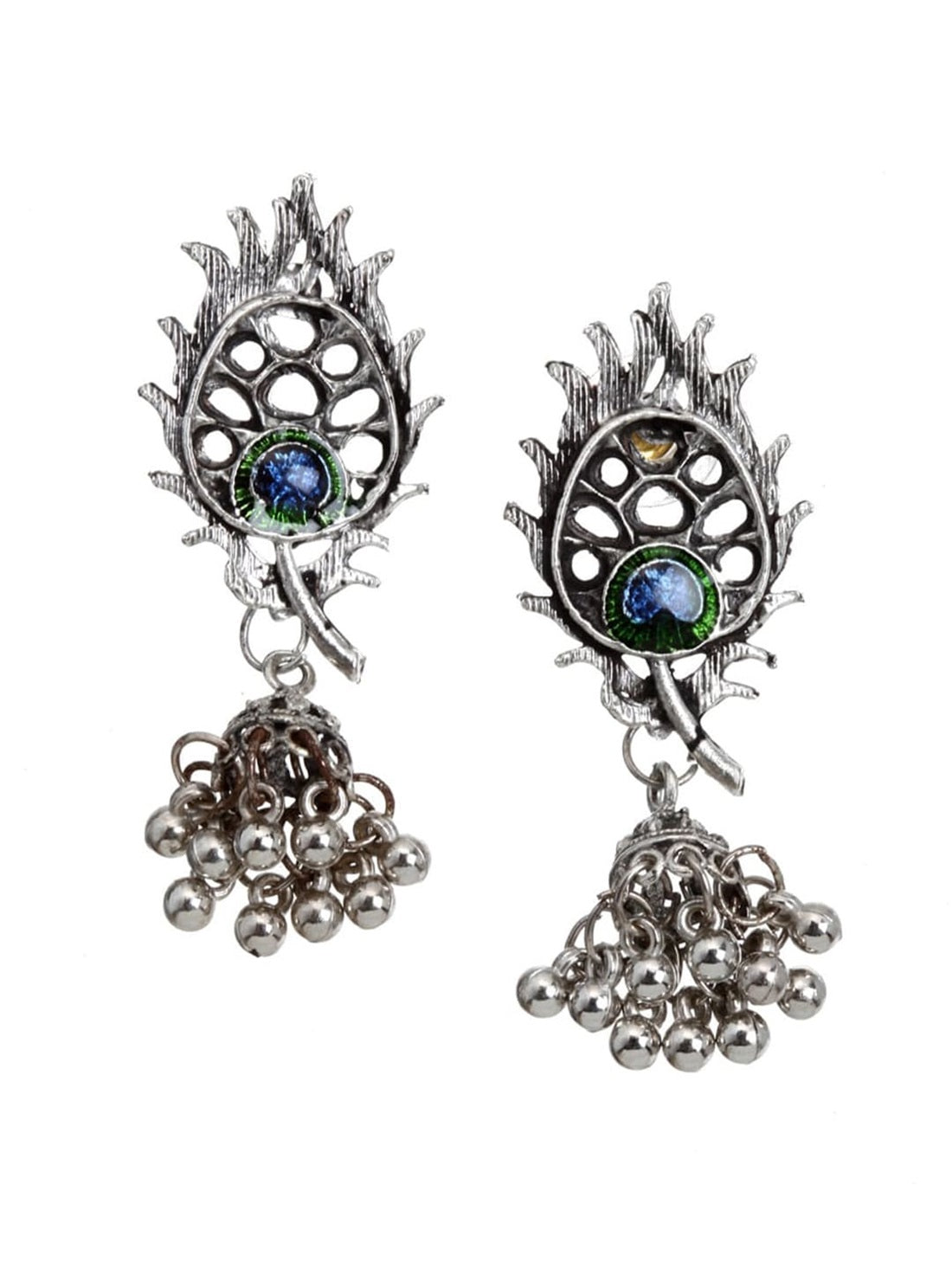 Celebrate Tradition With This Oxidised Silver-Plated Peacock Feather Jewelry Set By Vastrabhushan. This Exquisite Set Features A Beautifully Crafted Necklace Adorned With Intricate Blue And Green Peacock Feather Details, Secured With A Lobster Hook Closure For A Secure Fit. The Set Is Completed With Matching Jhumka Earrings, Secured With Post-And-Back Closures, Offering A Harmonious Blend Of Elegance And Cultural Charm. Handcrafted From Durable Brass And Coated With Silver Plating, This Jewelry Set Is Perfect For Festive Occasions Or Traditional Celebrations.