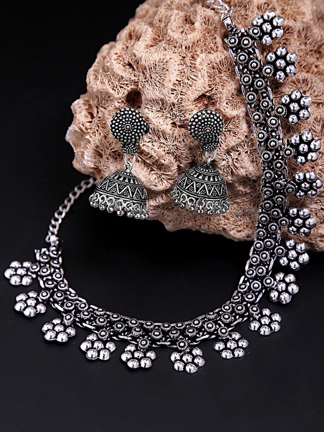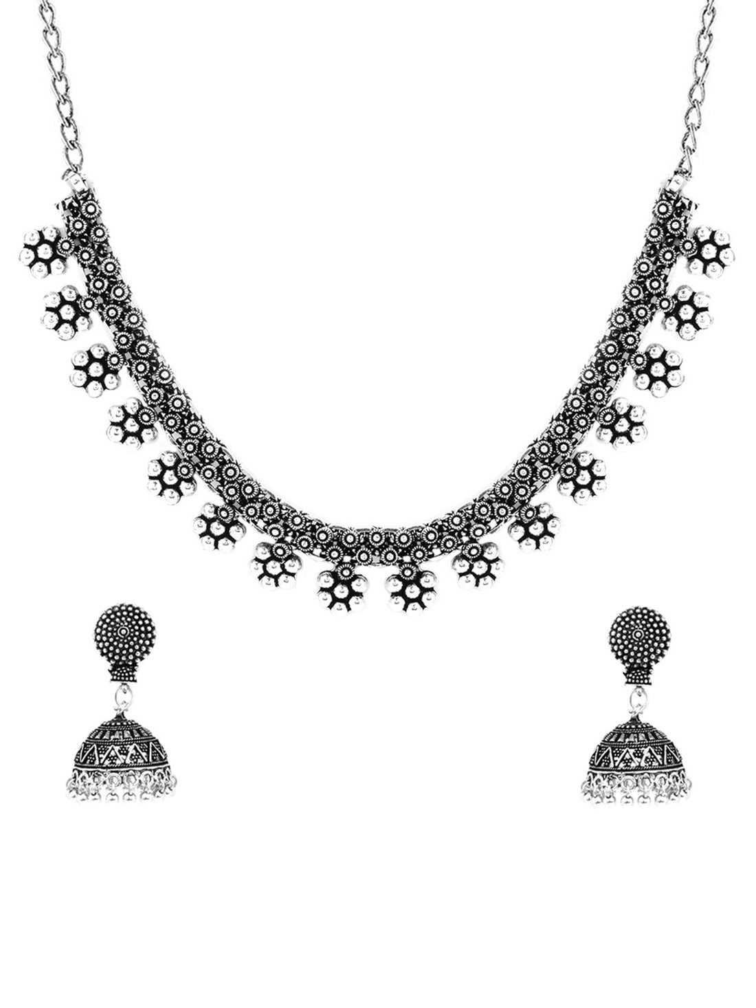 Celebrate The Timeless Charm Of Kolhapuri Artistry With This Oxidised Silver-Plated Floral Jewelry Set By Vastrabhushan. Handcrafted With Precision, The Necklace Showcases Intricate Floral-Shaped Detailing, Secured With A Sturdy Hook Closure. Paired With Matching Jhumkis Featuring A Secure Post-And-Back Closure, This Set Is A Perfect Blend Of Elegance And Traditional Craftsmanship. Ideal For Festive Occasions, Weddings, Or Cultural Celebrations, This Jewelry Set Is A Must-Have For Those Who Adore Ethnic Accessories.