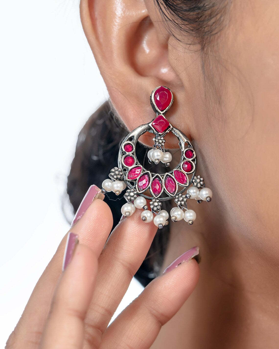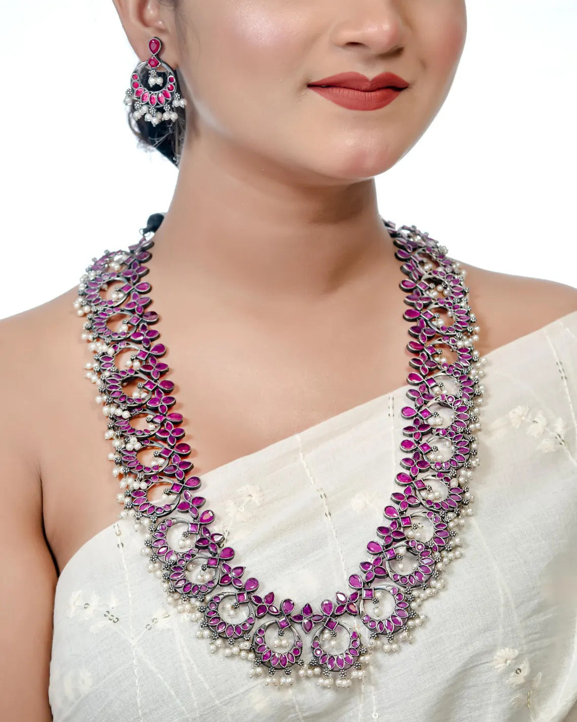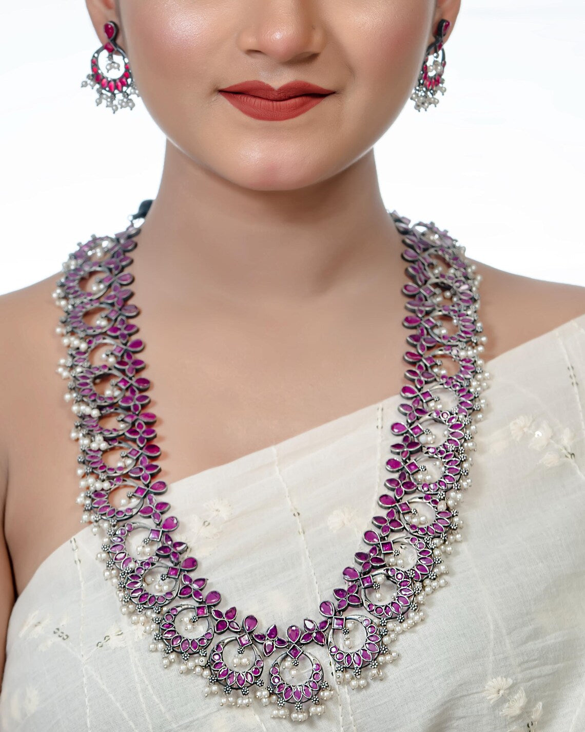 This Season, Style Up With A Necklace Set That Spells Opulence. This Necklace Set Falls On Your Neck With Grace. It Features Delicate Yet Striking Details That Will Leave You Feeling Pretty All Day Long. It Is Crafted In German Silver With Multicolour Stones And A Bold Pendant That Boasts An Intricate And Detailed Design With Pearls. This Necklace Celebrated The Rich Indian Culture And Spells Novel Folklore. Style This Up For A Rich Festive Look.