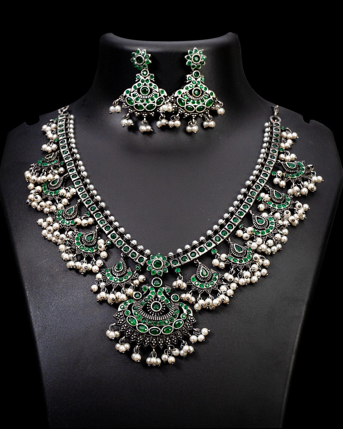You Can Never Go Wrong With Statement Necklaces. Beautifully Ornate With Floral Motifs , Colourful Stones & Hanging Pearls, This One Of A Kind Necklace Set Will Make You Fall In Love With It Instantly. Handcrafted In German Silver With Oxidized Silver Plating , This Glorious Set Has A Breathtaking Impact Of Instantly Adding Glam To Your Outfits. They Look Splendid With Your Sarees , Low Neck Kurtas Or Even With Your Lehengas.