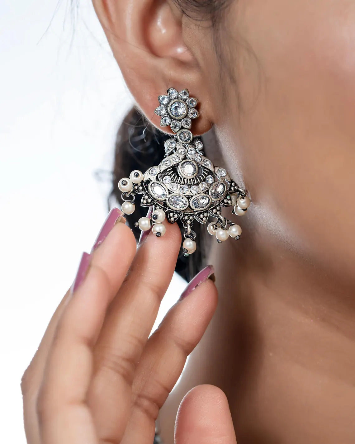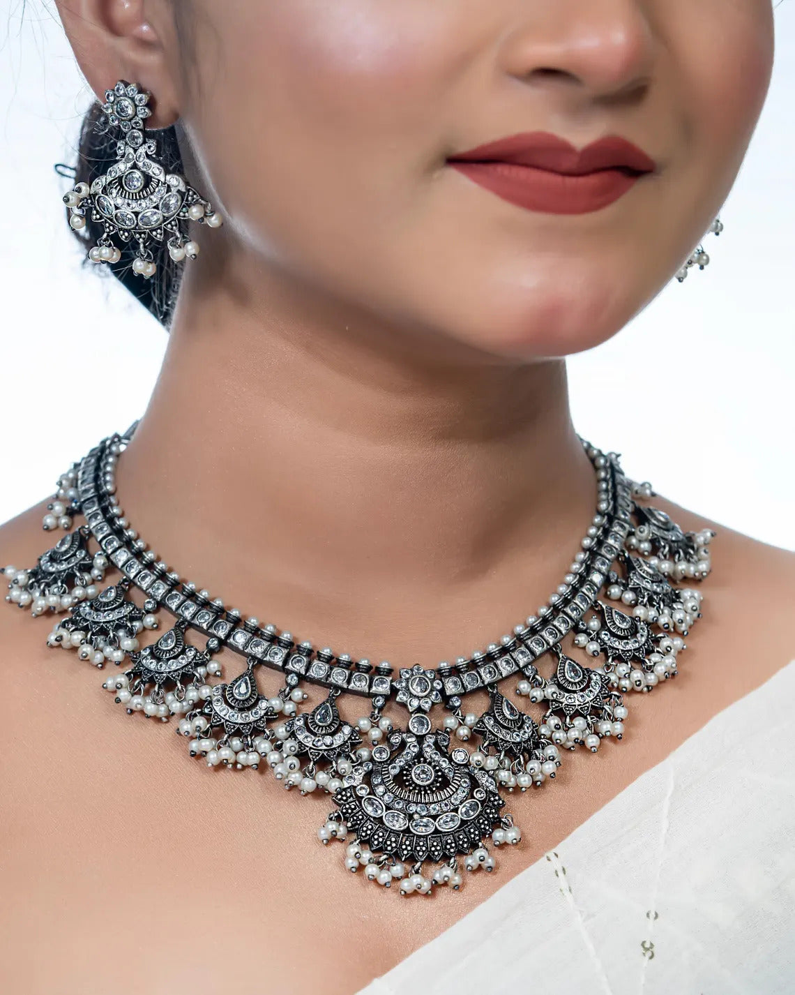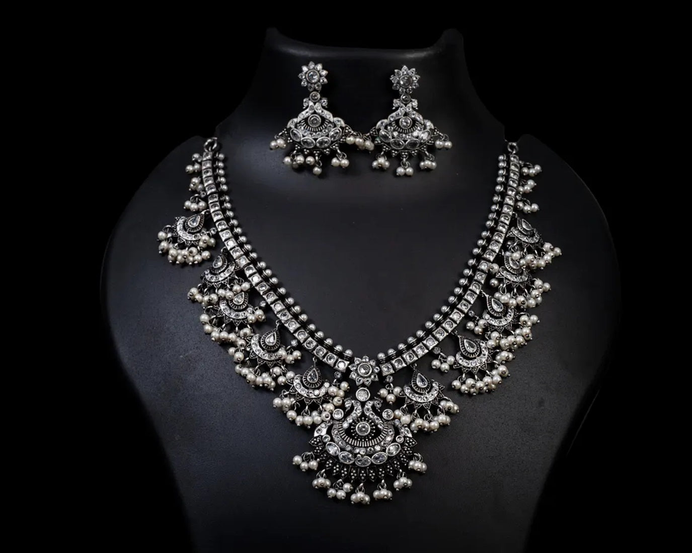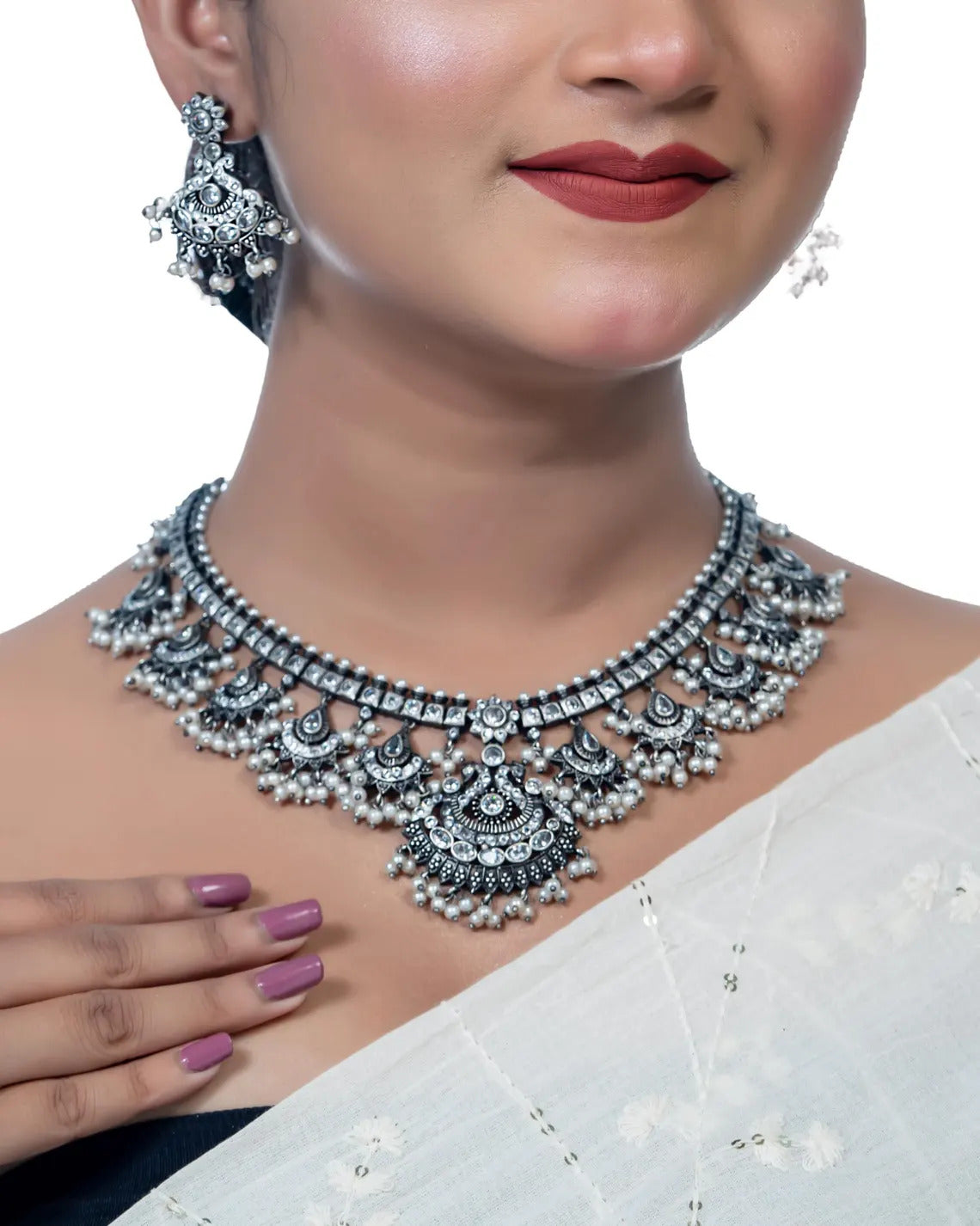 You Can Never Go Wrong With Statement Necklaces. Beautifully Ornate With Floral Motifs , Colourful Stones & Hanging Pearls, This One Of A Kind Necklace Set Will Make You Fall In Love With It Instantly. Handcrafted In German Silver With Oxidized Silver Plating , This Glorious Set Has A Breathtaking Impact Of Instantly Adding Glam To Your Outfits. They Look Splendid With Your Sarees , Low Neck Kurtas Or Even With Your Lehengas.
