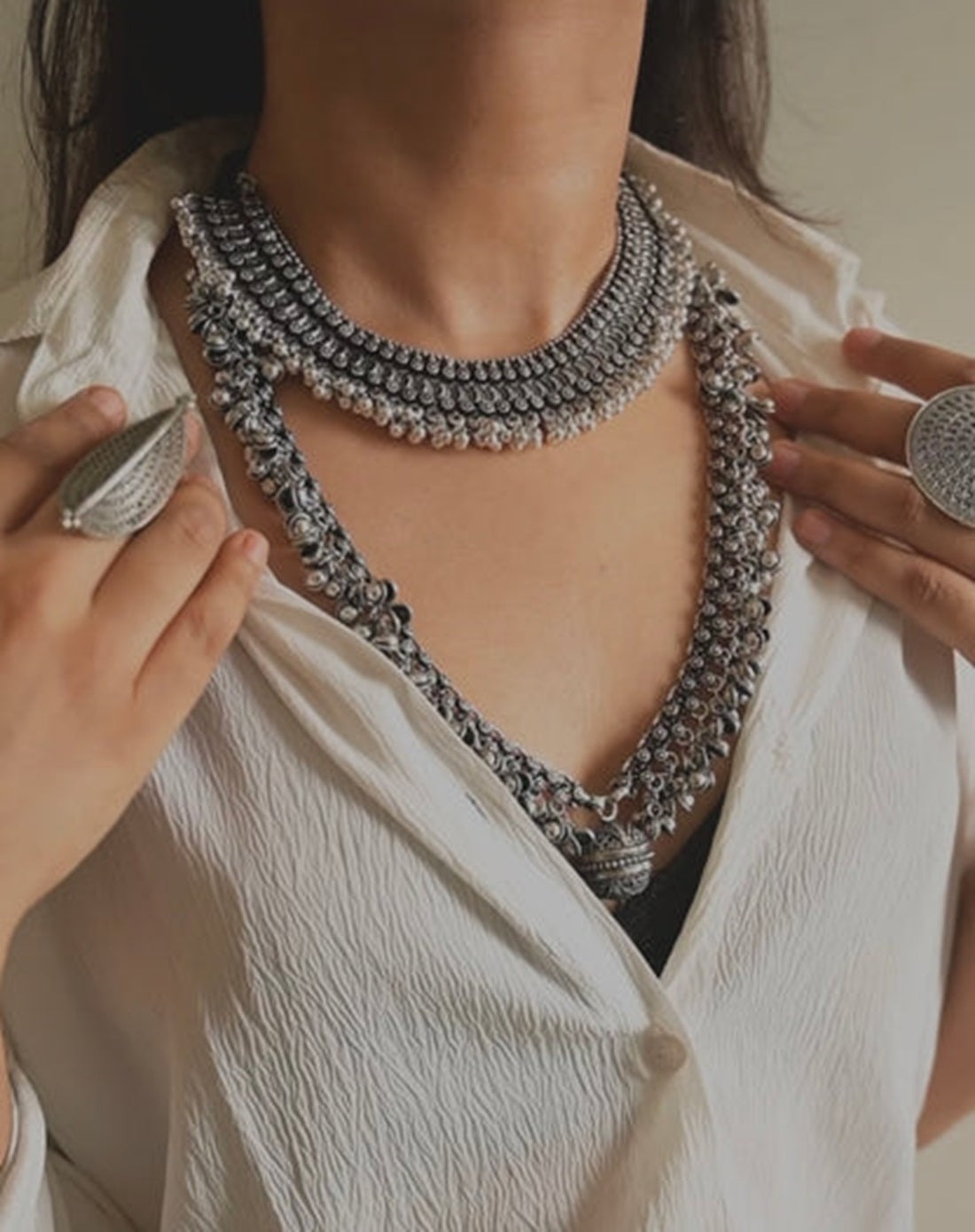 Enhance Your Jewelry Collection With This Oxidised Silver Necklace And Choker Combo By Vastrabhushan. Featuring Two Beautifully Crafted Pieces, This Combo Includes An Oxidised Silver Necklace And A Matching Choker, Both Adorned With Intricate Ghungroo Details That Add A Touch Of Traditional Charm. Perfect For Pairing With Ethnic Or Fusion Outfits, This Versatile Set Is Ideal For Festive Occasions, Celebrations, Or Everyday Styling To Make A Unique Statement.