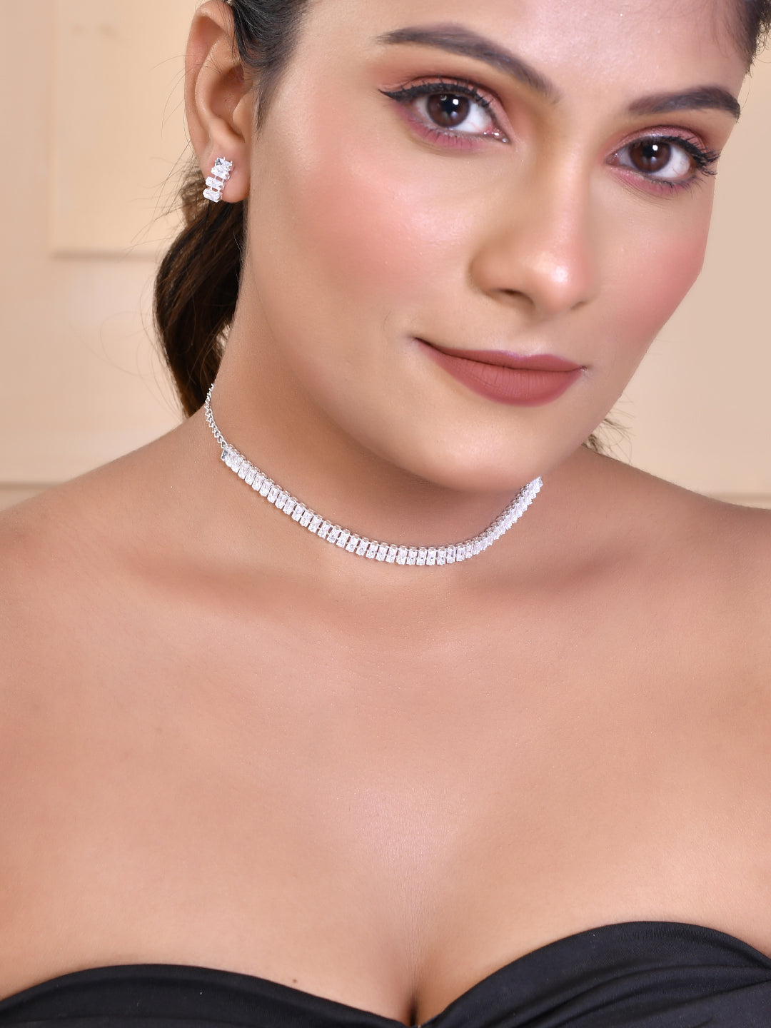 Introducing Our Silver-Plated White Cubical Beads Choker Set, Complete With Matching Earrings For A Perfectly Coordinated Look. This Exquisite Set Features Delicately Crafted Choker Adorned With White Cubical Beads, Exuding Timeless Elegance And Sophistication. The Silver-Plated Finish Adds A Touch Of Luxury, Making It Perfect For Both Formal Events And Everyday Wear. Elevate Your Style With This Versatile And Chic Jewellery Set That Effortlessly Enhances Any Outfit.
