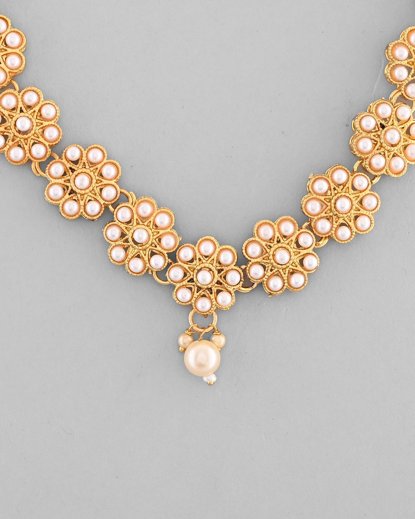 Women's Gold Plated Pearl Studded Floral Necklace And Earrings