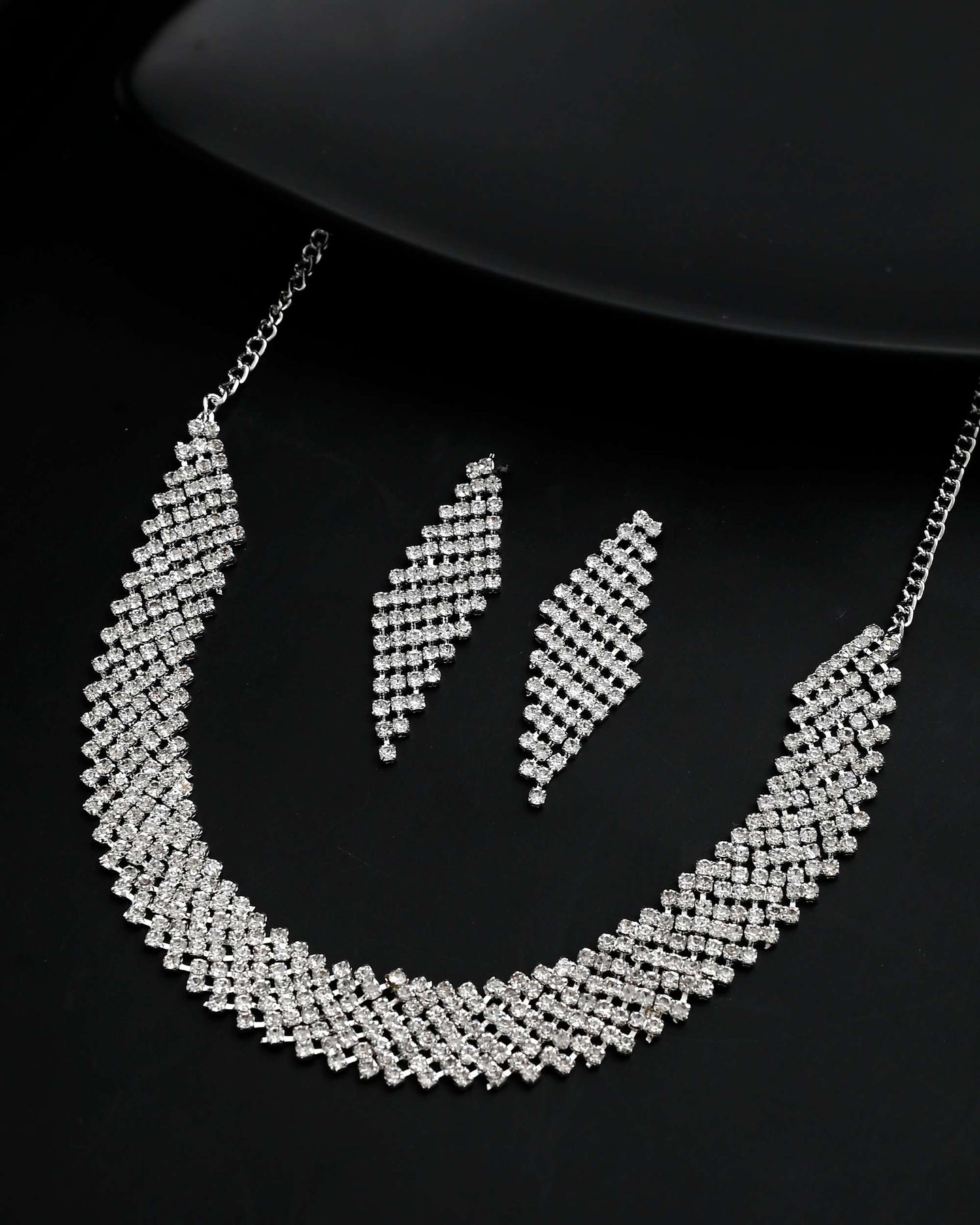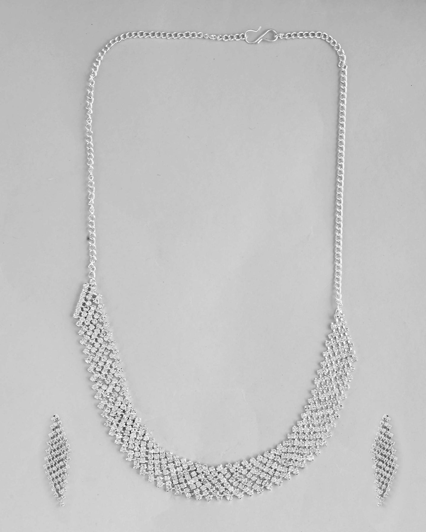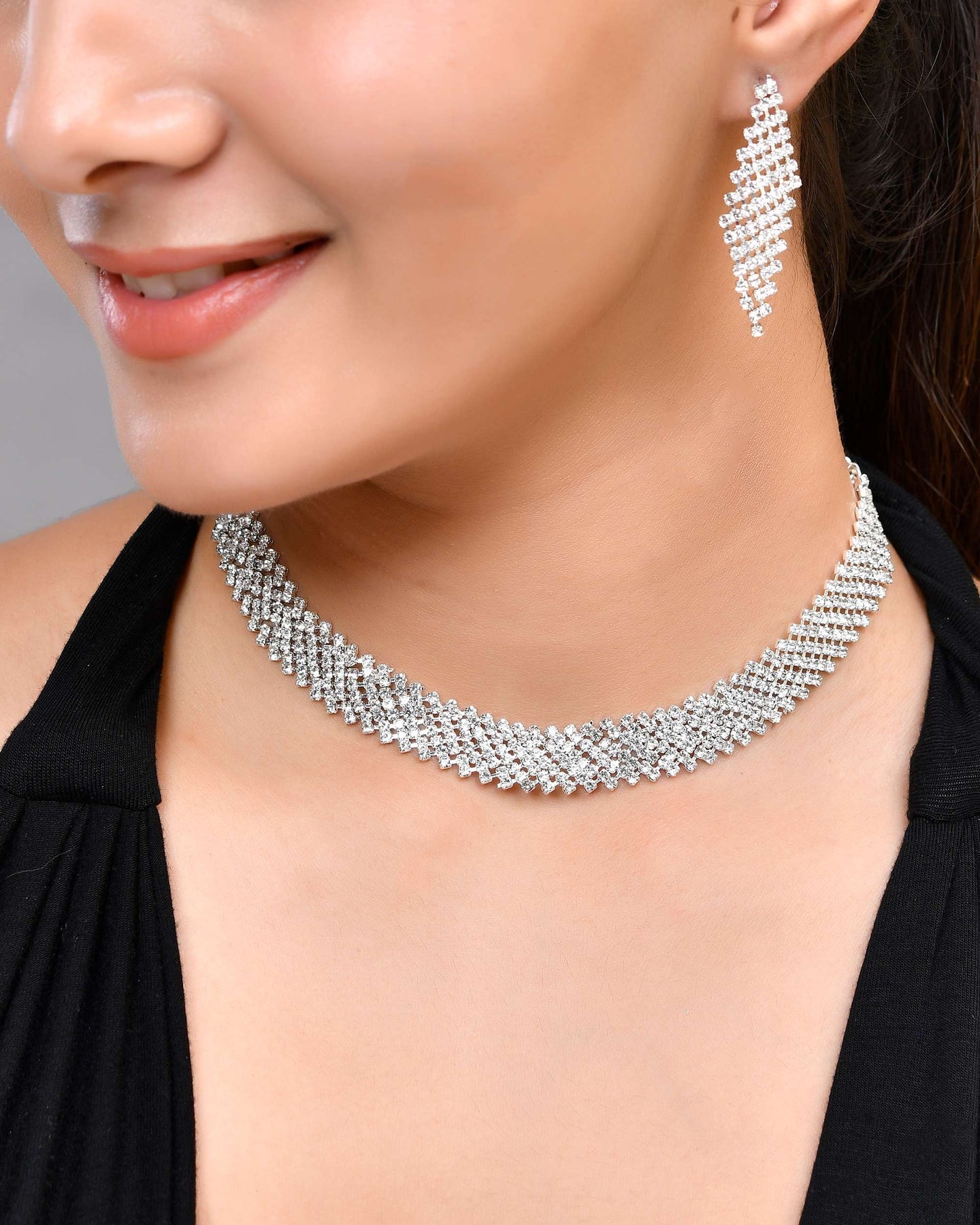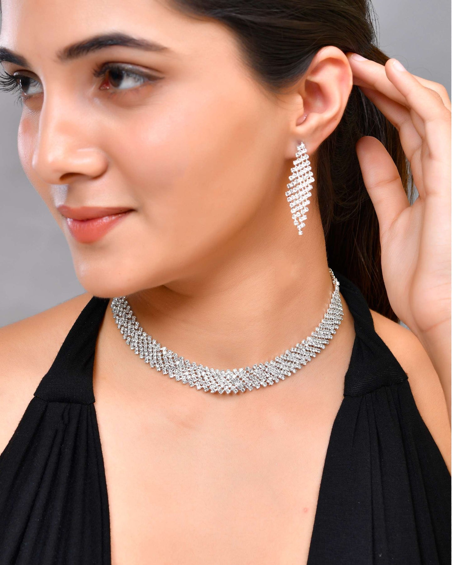 Here’s a description for your Silver Plated AD Studded Choker and Earrings Set: