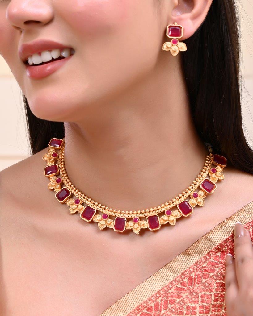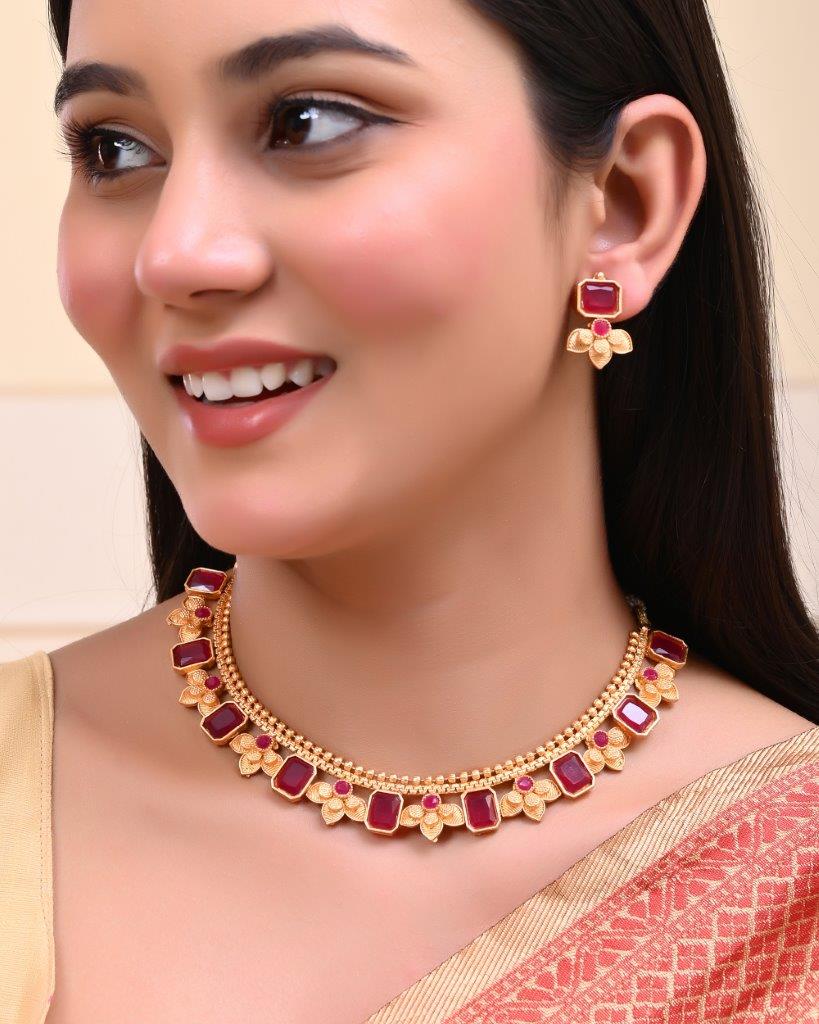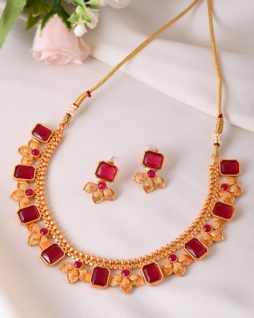 Elevate Your Elegance With Our Gold Plated Traditional Maroon Stone Studded Jewellery Set. This Exquisite Set Features Stunning Maroon Stones Intricately Set In A Radiant Gold-Plated Design, Embodying Traditional Craftsmanship. Perfect For Weddings, Festivals, Or Special Occasions, The Necklace And Matching Earrings Add A Rich Pop Of Color To Any Outfit. A Timeless Addition To Your Jewellery Collection!