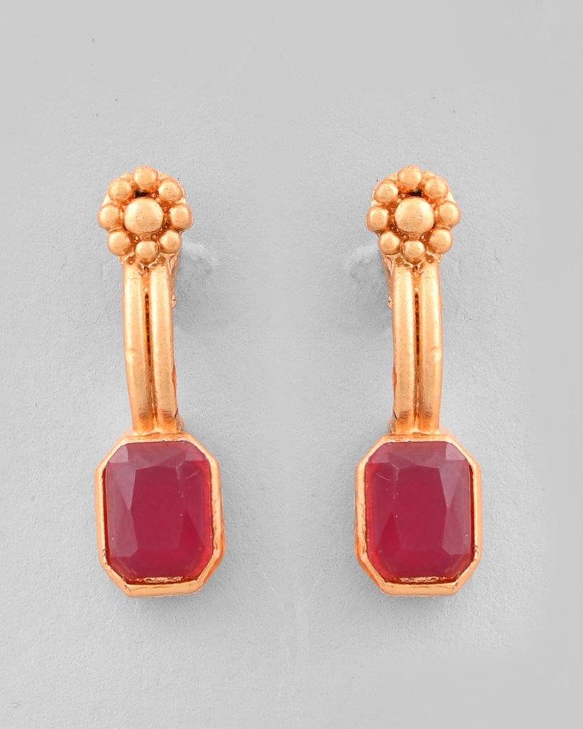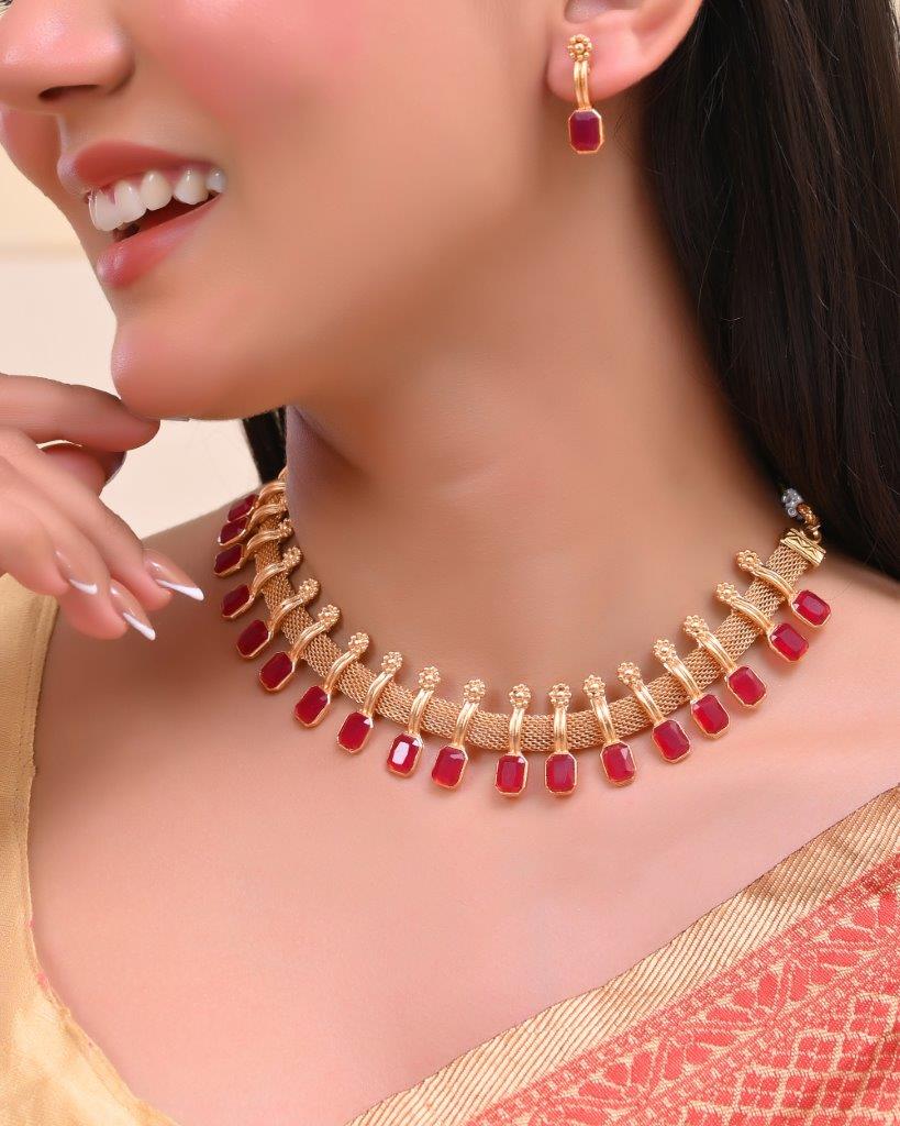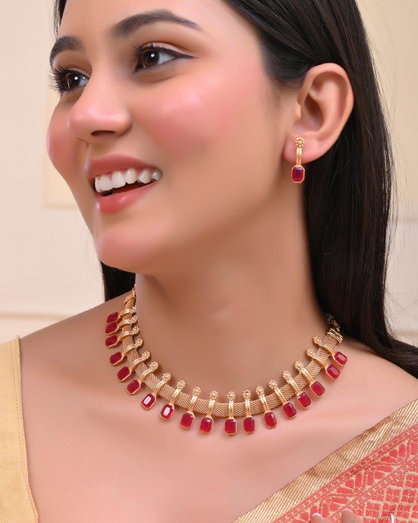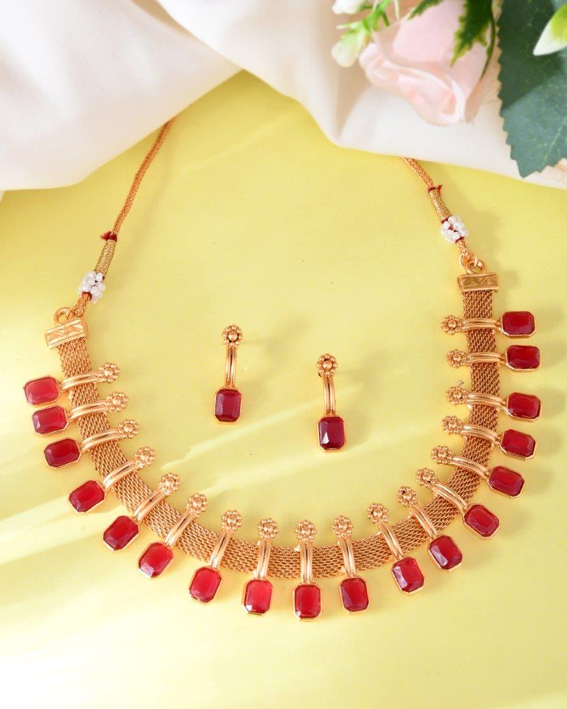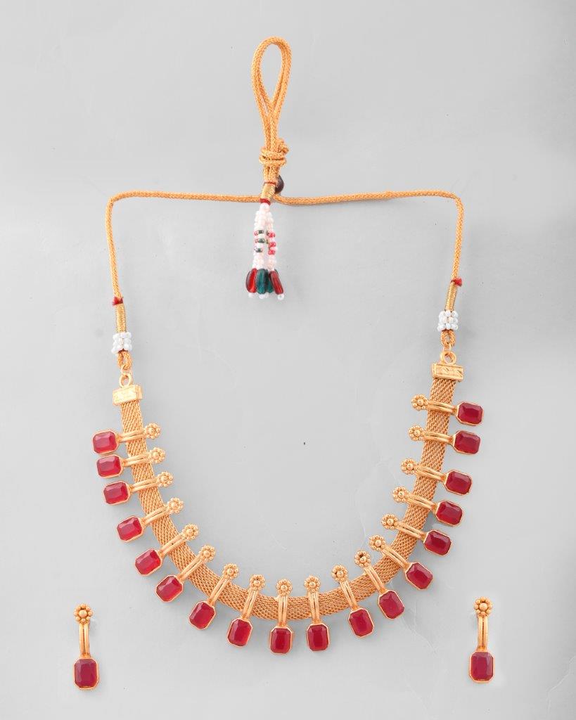 Discover Elegance With Our Gold Plated Traditional Maroon Stone Studded Necklace And Earrings Set. This Stunning Set Features Intricately Designed Maroon Stones That Beautifully Complement The Radiant Gold Plating, Adding A Touch Of Sophistication. Ideal For Weddings, Festive Occasions, Or Special Events, This Set Enhances Any Attire And Showcases Your Timeless Style. A Must-Have Addition To Your Jewelry Collection!