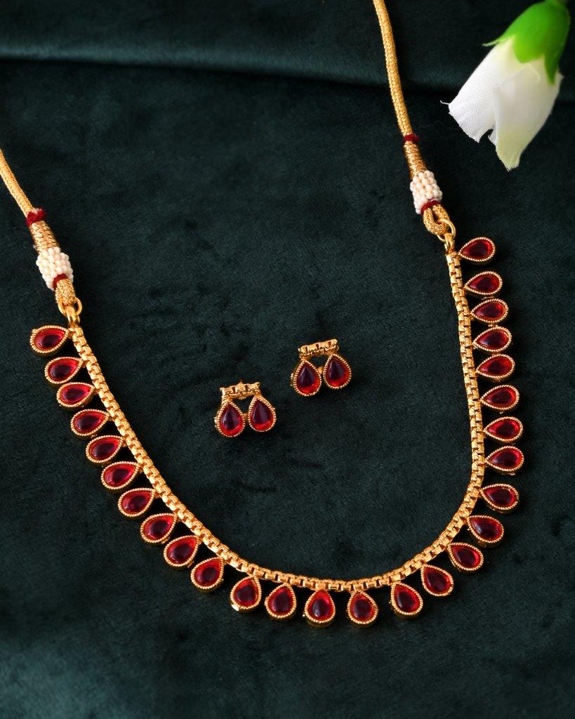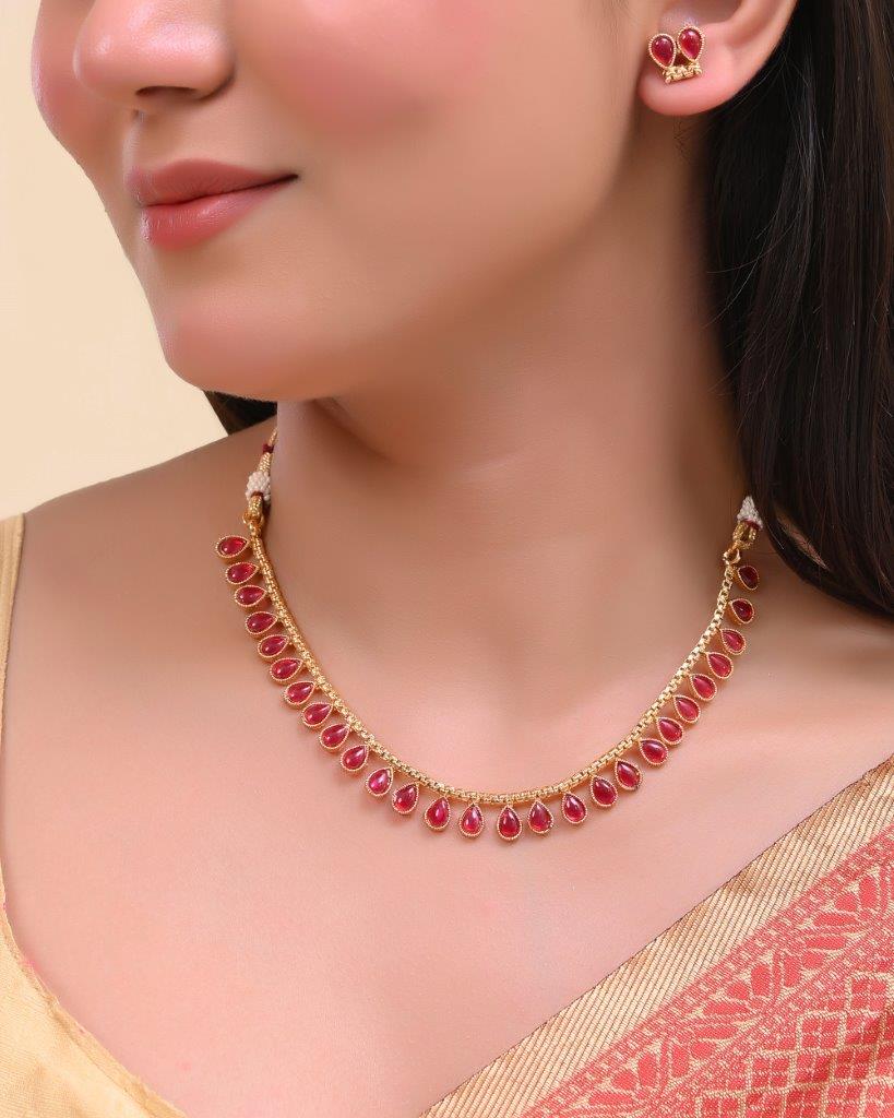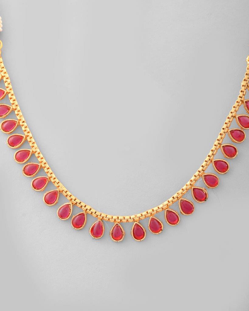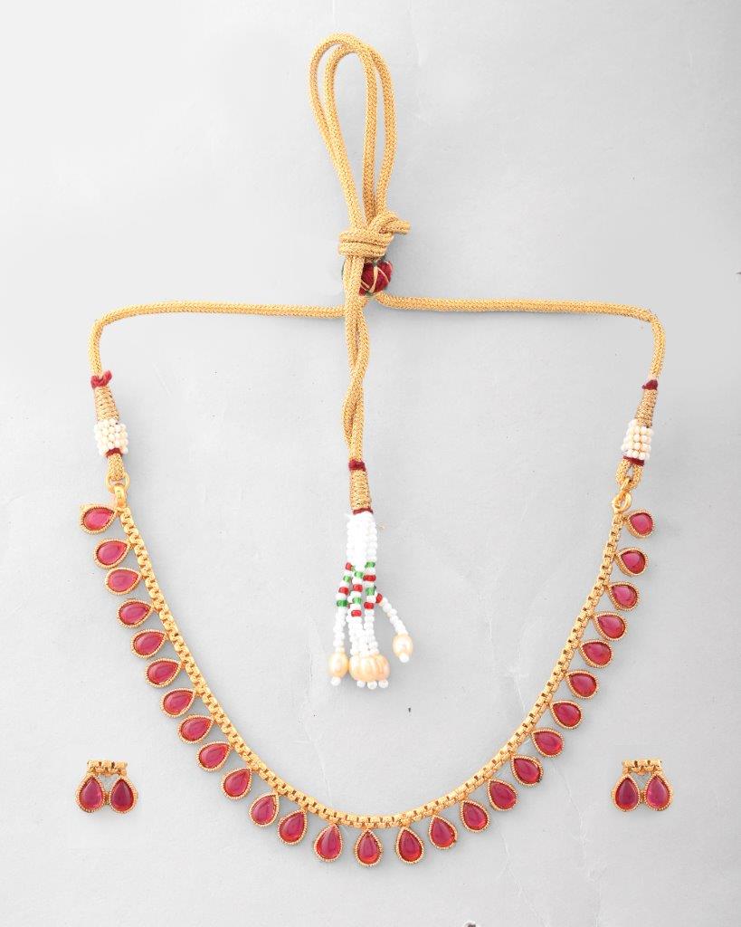 Adorn Yourself With Our Gold Plated Maroon Stone Studded Jewellery. This Stunning Collection Features Intricate Designs Adorned With Rich Maroon Stones Set In Radiant Gold Plating, Exuding Elegance And Sophistication. Perfect For Weddings, Festivals, Or Special Occasions, This Jewellery Set Complements Any Attire And Enhances Your Overall Look. Make A Bold Statement With This Timeless Addition To Your Collection.