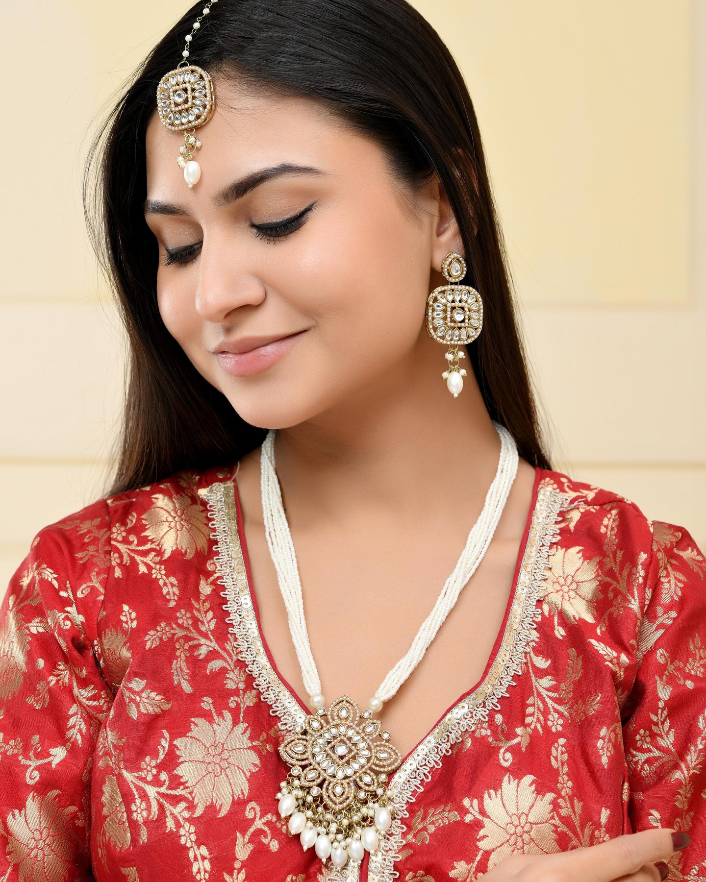 This Gold-Plated Kundan Stone-Studded Long Jewelry Set Exudes Traditional Elegance With A Touch Of Luxury. The Intricate Kundan Stones Create A Regal And Captivating Design, While The Gold-Plated Finish Adds A Sophisticated Shine. Perfect For Weddings, Festivals, Or Special Occasions, This Set Adds A Timeless, Royal Appeal, Enhancing Your Outfit With Stunning Beauty And Grace.