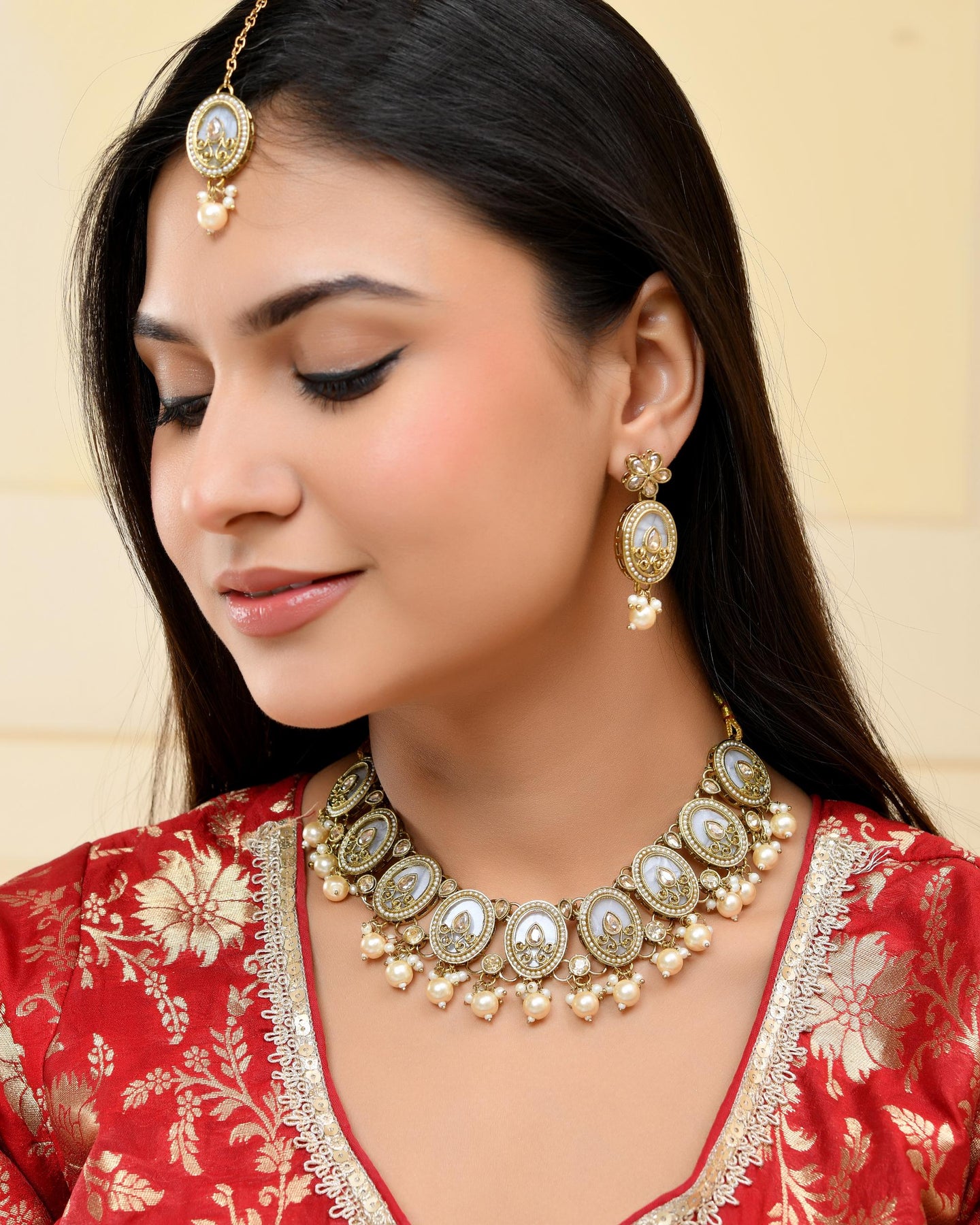This Gold-Plated Kundan Stone-Studded Necklace Set Features A Stunning White Design, Complemented By A Matching Maang Tikka And Earrings. The Intricate Kundan Stones Add A Royal And Elegant Touch, Perfect For Weddings Or Traditional Occasions. The Set Offers A Timeless, Sophisticated Appeal, Making It The Ideal Choice To Enhance Your Beauty And Complete Your Bridal Or Festive Look.