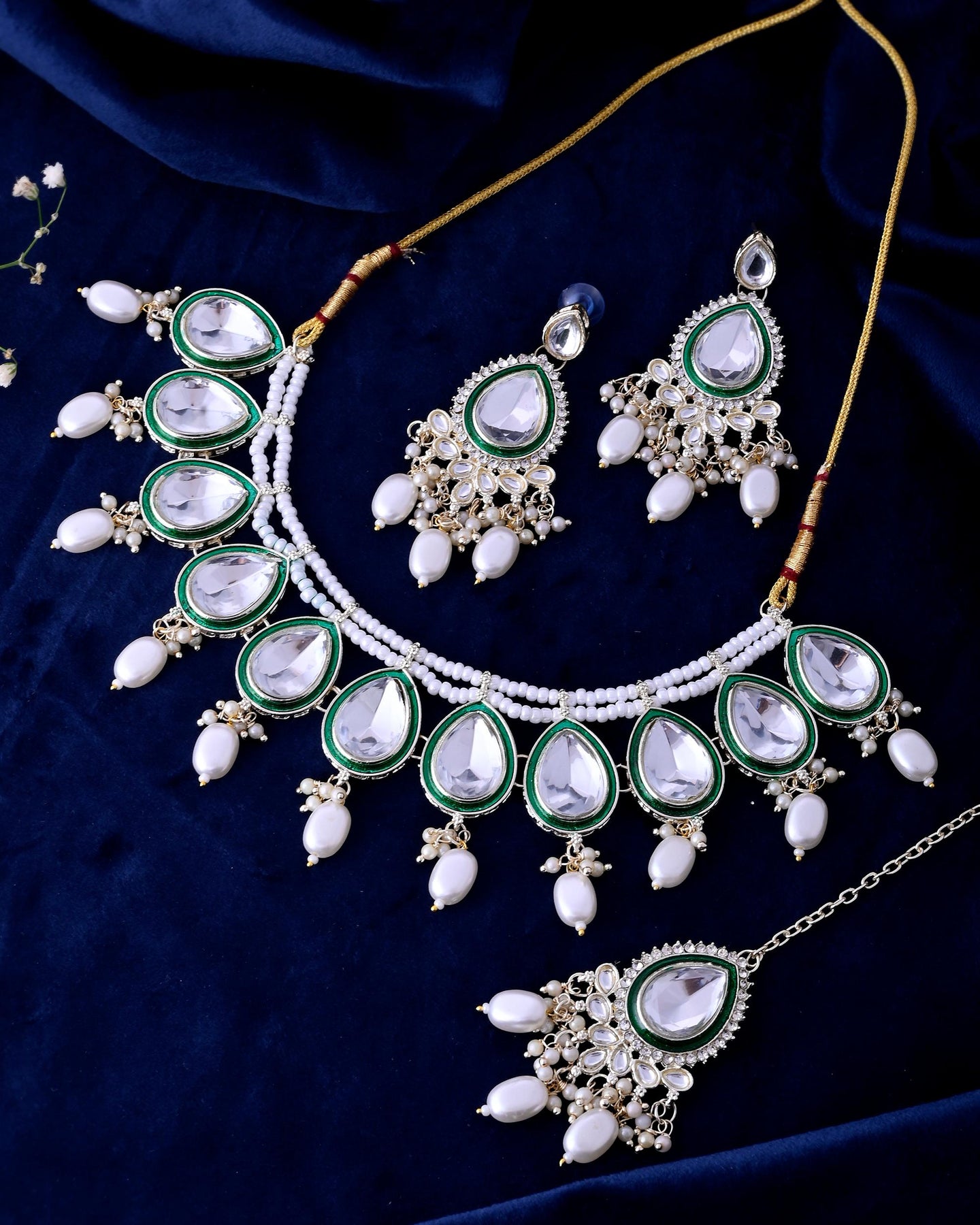 This Gold-Plated White Kundan Stone-Studded Choker Set Is The Epitome Of Elegance. The Intricate Kundan Stones Create A Regal Look, While The Matching Earrings And Maang Tikka Complete The Ensemble With A Touch Of Traditional Charm. Perfect For Weddings, Festivals, Or Special Occasions, This Set Adds A Luxurious And Timeless Appeal, Making You Shine On Every Occasion.