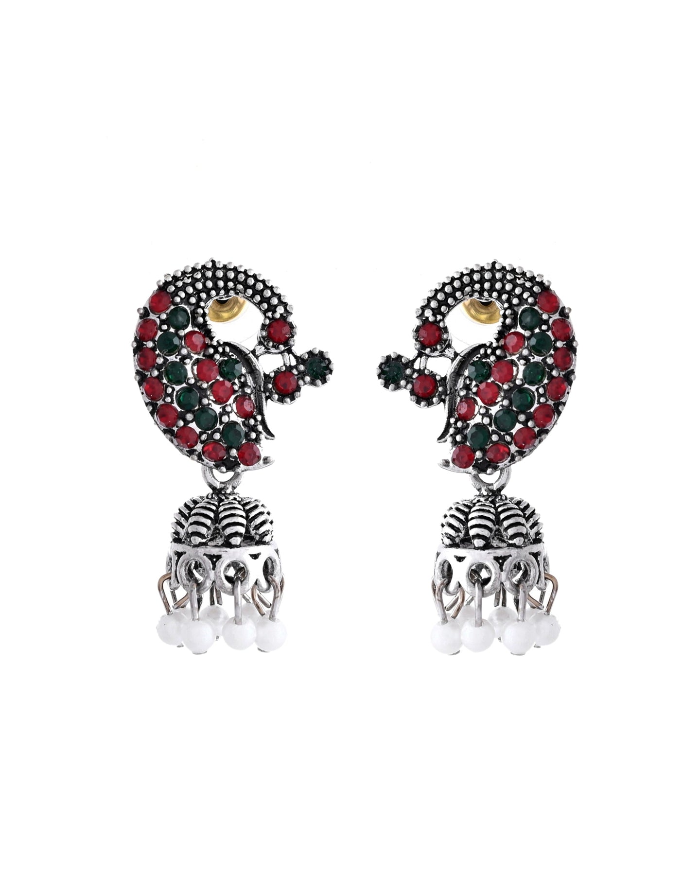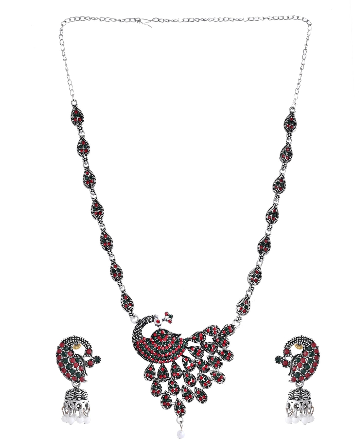 This Silver Plated Peacock Shaped Multi-Color Stone Studded Jewellery Set Showcases Exquisite Craftsmanship And Vibrant Beauty. Featuring A Stunning Peacock Design, Adorned With Multi-Color Stones, It Captures The Essence Of Traditional Elegance With A Modern Twist. Perfect For Weddings, Festivals, Or Special Occasions, This Set Adds A Bold And Graceful Touch, Making It A Timeless Addition To Any Jewelry Collection.