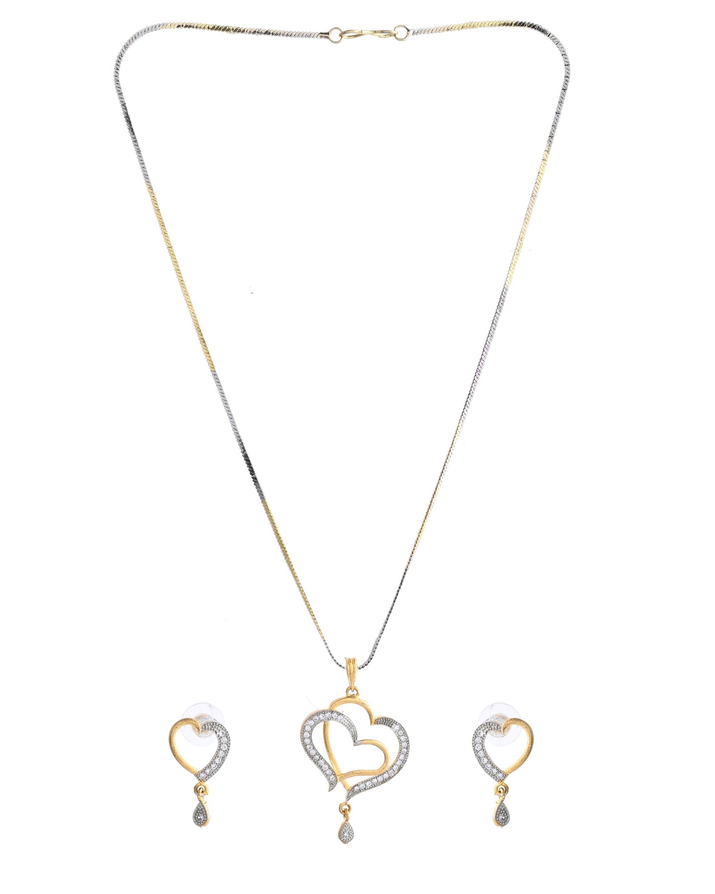 This Dual Tone Ad Stone Studded Heart Shaped Chain Set With Pendant Offers A Perfect Blend Of Romance And Elegance. Featuring A Heart-Shaped Pendant Adorned With Sparkling Ad Stones And Set In A Dual-Tone Finish, It Creates A Sophisticated, Timeless Look. Ideal For Special Occasions Or As An Everyday Statement Piece, This Set Adds A Touch Of Charm And Luxury To Your Jewelry Collection.