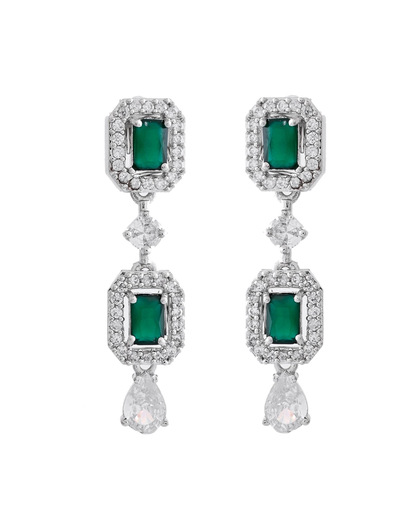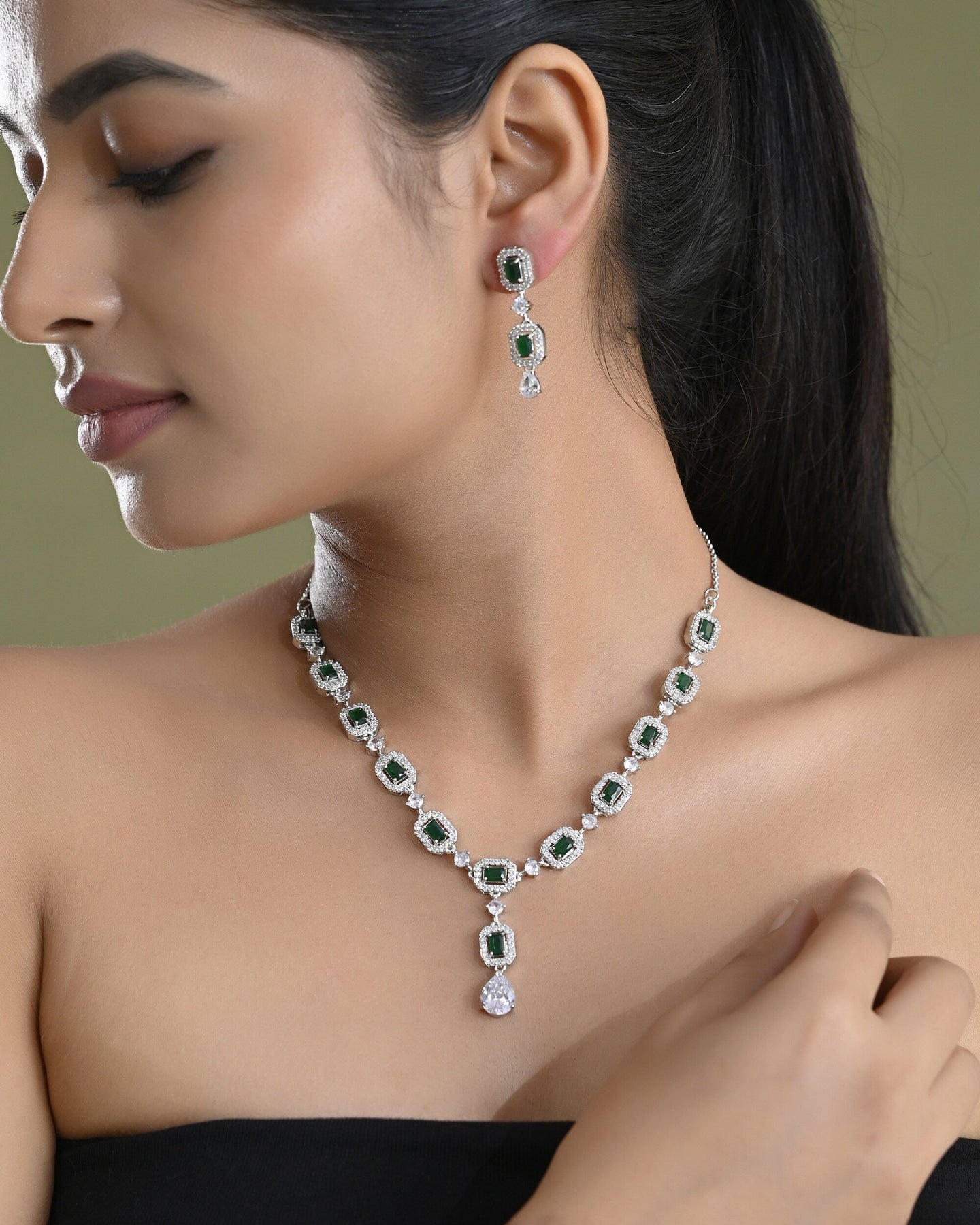 This Silver Plated Green Stone Geometrical Shaped Ad Jewellery Set Blends Modern Design With Classic Elegance. Featuring Striking Geometrical Shapes Adorned With Vibrant Green Stones And Sparkling American Diamond Accents, This Set Offers A Unique, Sophisticated Look. The Silver Plating Enhances Its Timeless Beauty, Making It The Perfect Choice For Special Occasions, Adding A Contemporary Yet Graceful Touch To Your Ensemble.