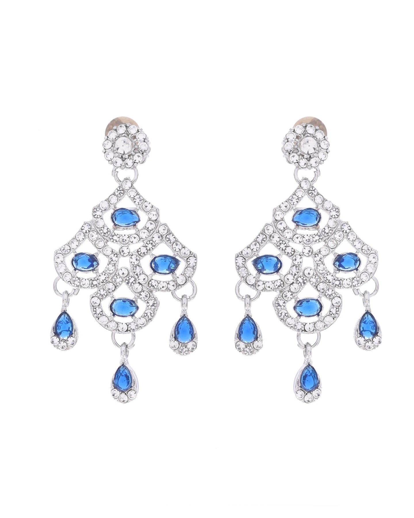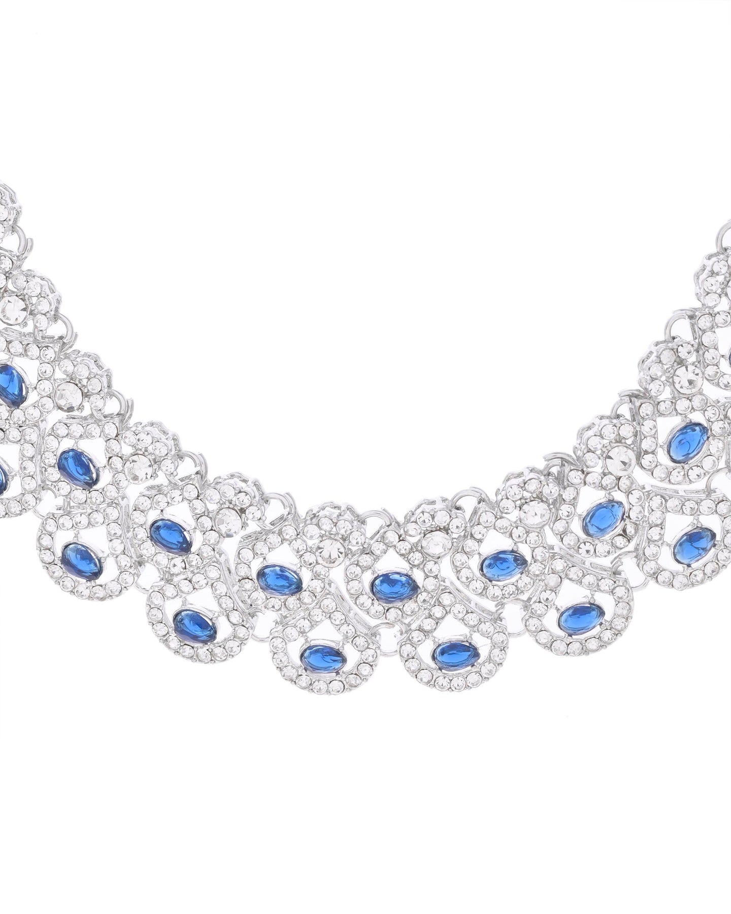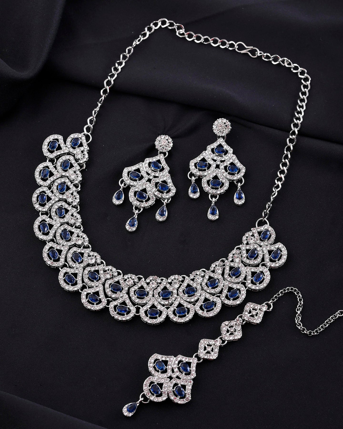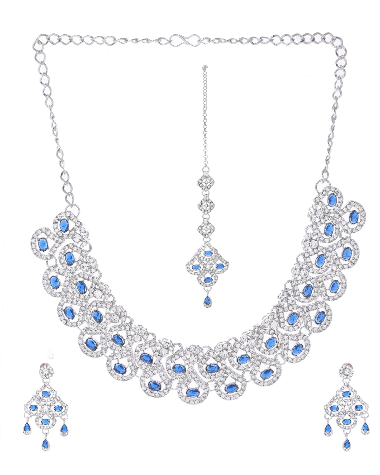 Add A Touch Of Sophistication To Your Ensemble With This Silver-Plated Blue Ad-Studded Elegant Jewellery Set. Featuring Intricate Detailing And Shimmering American Diamonds, This Set Is Perfect For Weddings, Parties, Or Festive Occasions. The Vibrant Blue Accents Enhance Its Charm, Making It A Statement Piece. Designed For Timeless Beauty, It Effortlessly Complements Both Traditional And Contemporary Outfits.