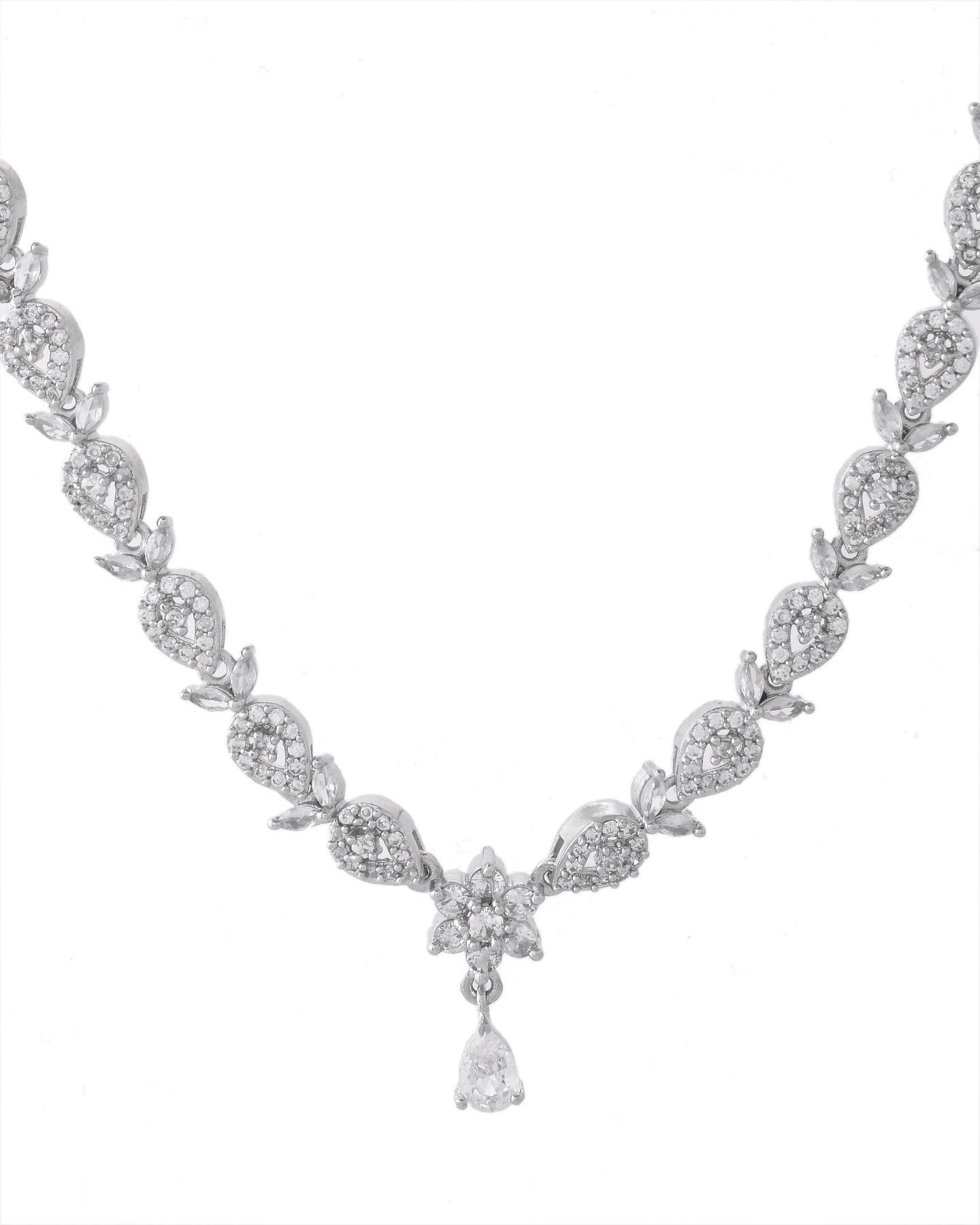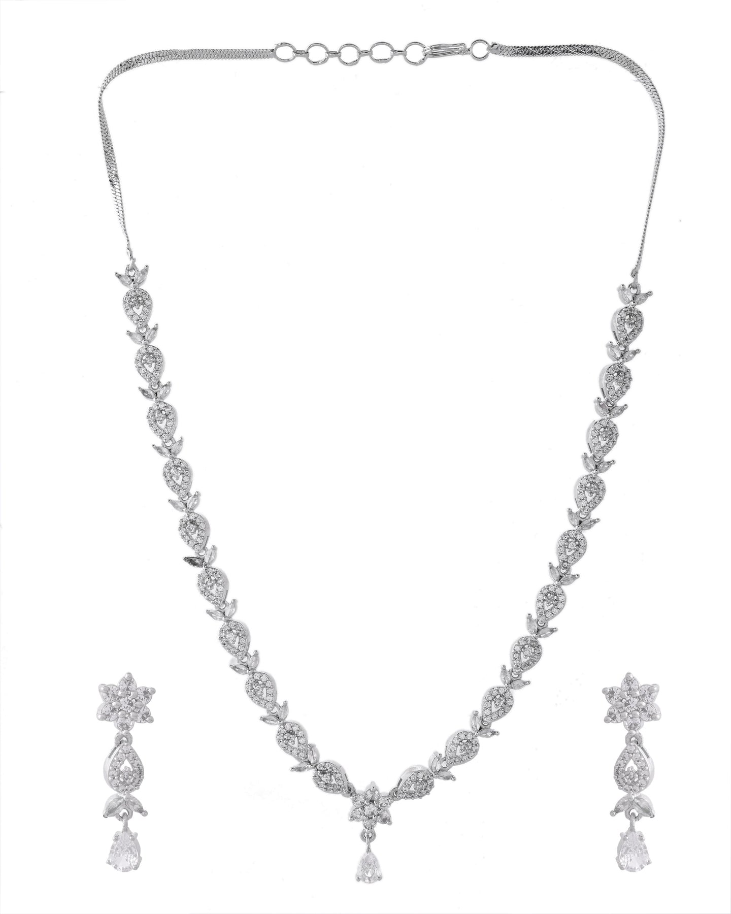 Shine Bright With This Silver-Plated Ad Studded Classic Jewellery Set. Featuring Dazzling Ad Stones Set In Timeless Designs, This Set Adds A Touch Of Elegance And Sparkle To Any Outfit. The Silver Plating Offers A Sleek, Polished Finish, While The Lightweight Pieces Ensure Comfortable Wear. Perfect For Festive Occasions Or Special Events, This Set Is A Must-Have For Your Collection.