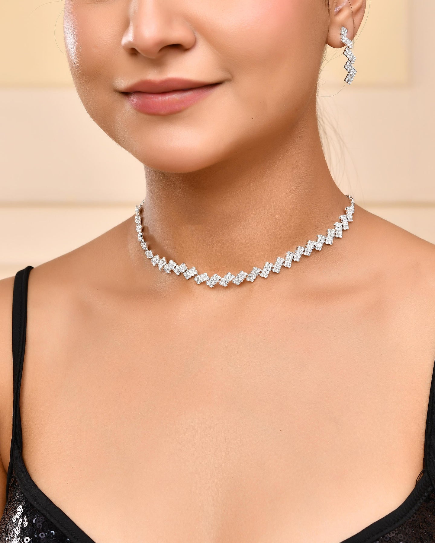 Enhance Your Everyday Elegance With This Silver Plated Stones Studded Minimal Designed Jewellery Set. Featuring Subtle Stone Accents And A Sleek, Modern Design, This Set Includes A Delicate Necklace And Matching Earrings. Perfect For Casual Wear Or Understated Occasions, It Adds A Touch Of Refined Sophistication To Any Outfit.