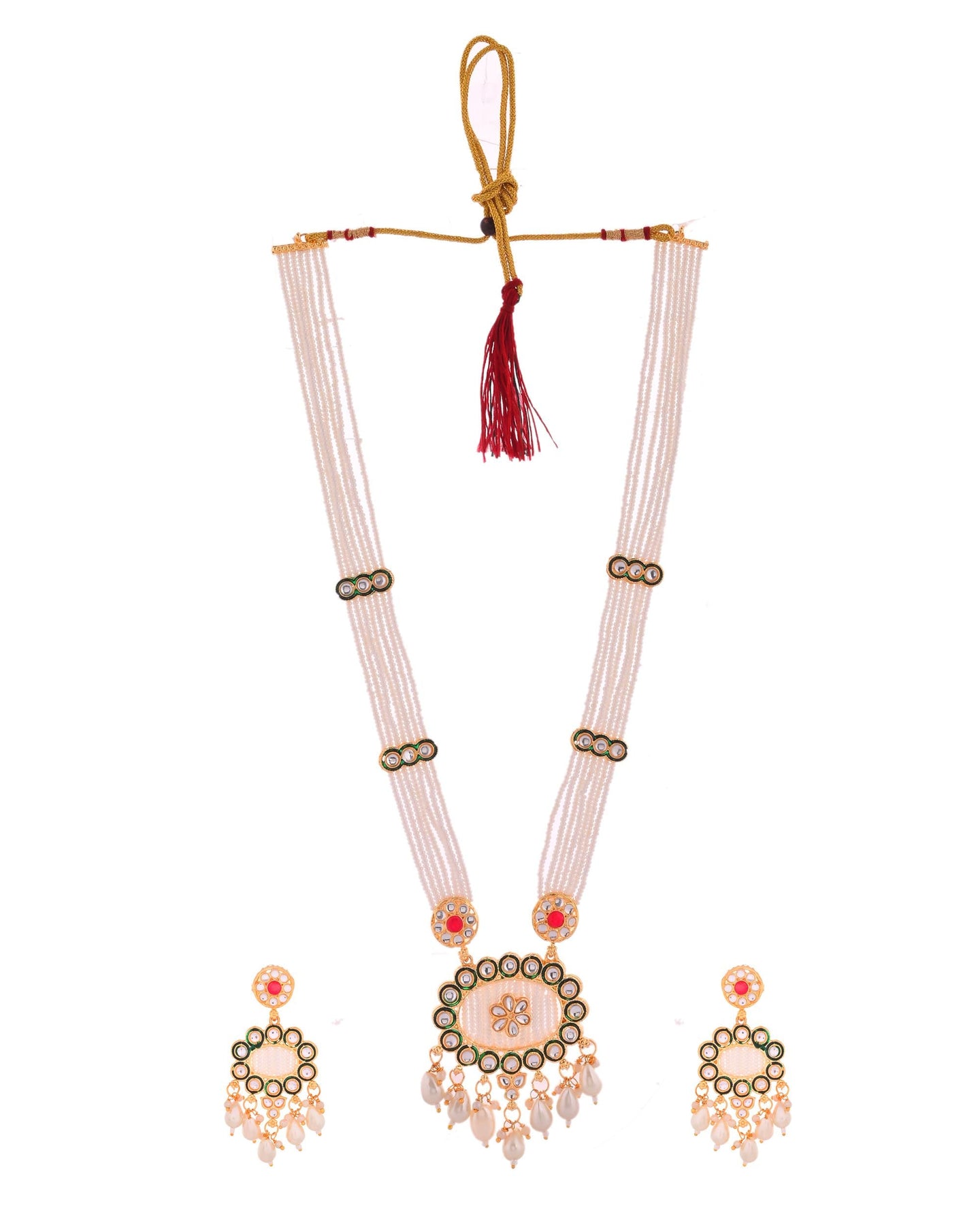 Add A Touch Of Traditional Charm With This Gold Toned Artificial Beads Studded Long Necklace And Earrings Set. Featuring Intricately Arranged Beads And A Radiant Gold-Toned Finish, This Elegant Set Brings Timeless Appeal To Your Ethnic Look. Perfect For Weddings, Festivals, And Grand Celebrations, It Effortlessly Enhances Your Outfit With Grace And Sophistication.
