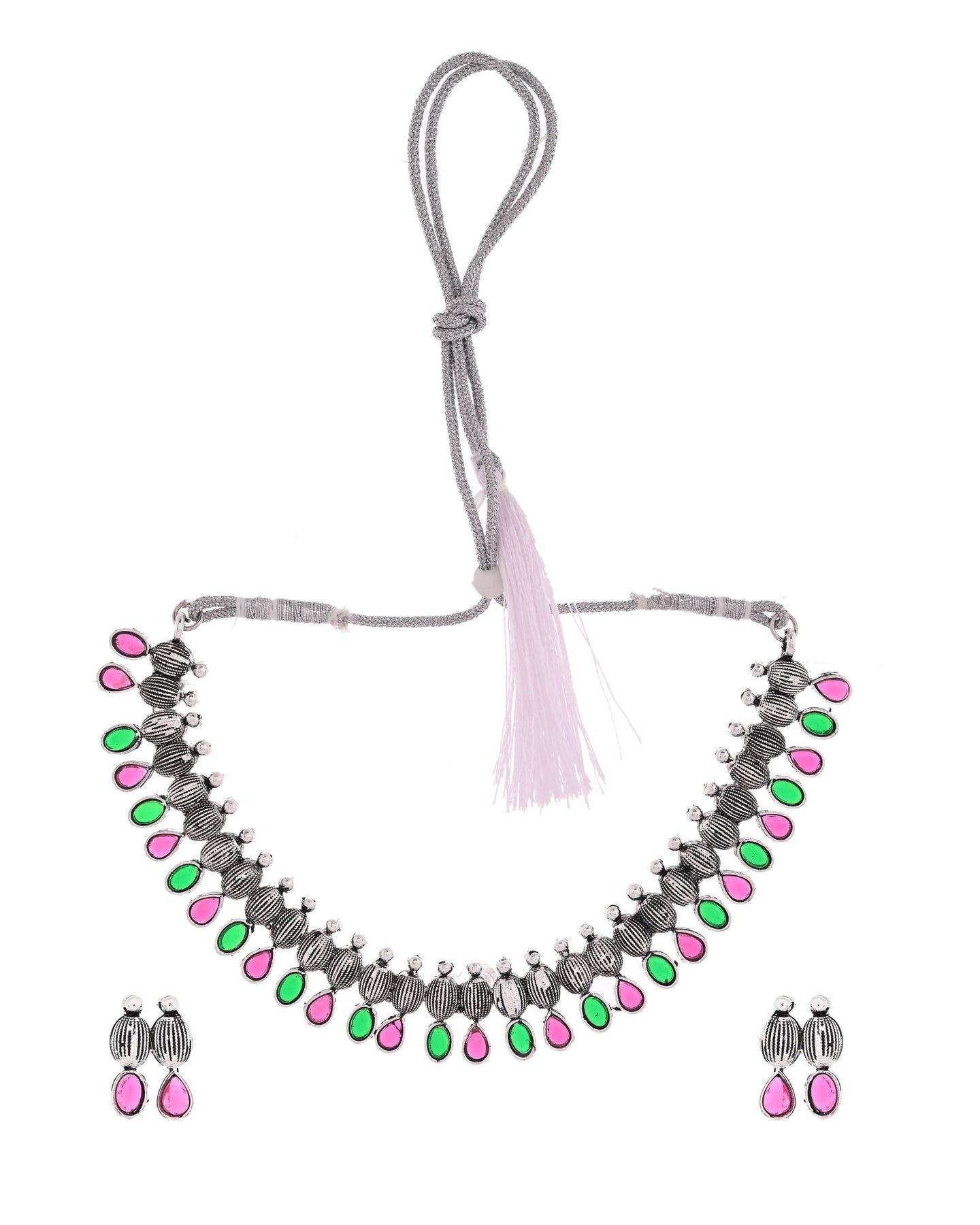 Add A Vibrant Touch To Your Ethnic Look With This Oxidized Silver-Toned Green And Pink Stone Studded Jewellery Set. Featuring Intricate Craftsmanship And A Striking Combination Of Green And Pink Stones, This Set Exudes Traditional Elegance With A Hint Of Color. Perfect For Festive Occasions, Cultural Celebrations, Or Casual Ethnic Wear, It’S A Must-Have For Timeless Charm.