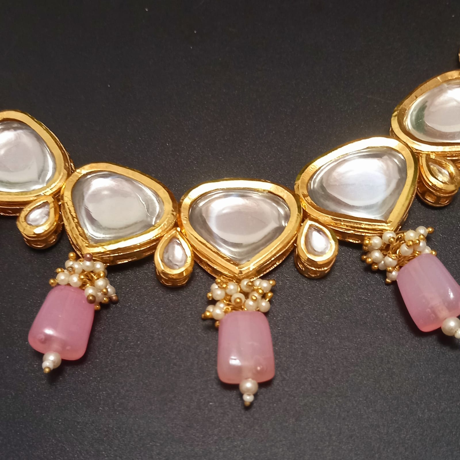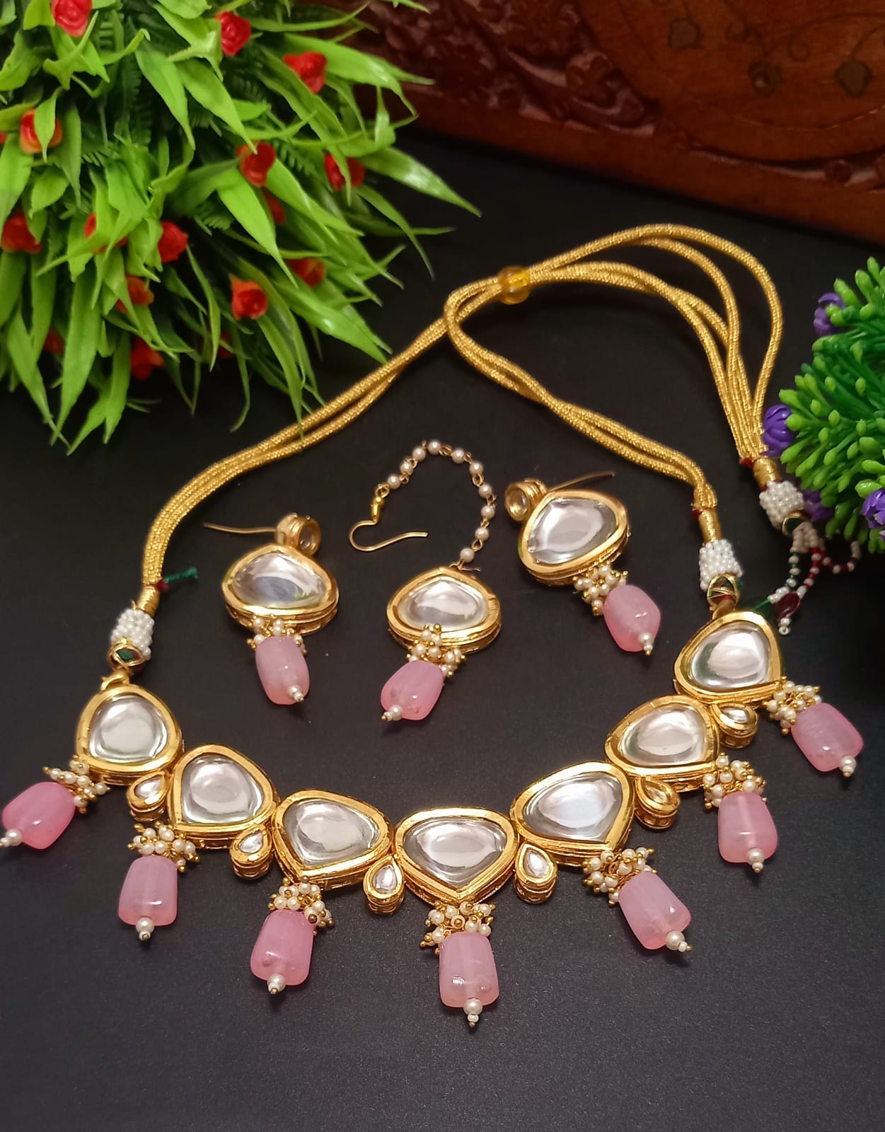Pink Colour Brass Shine Kundan Necklace Set Gold Plated With Maangtika