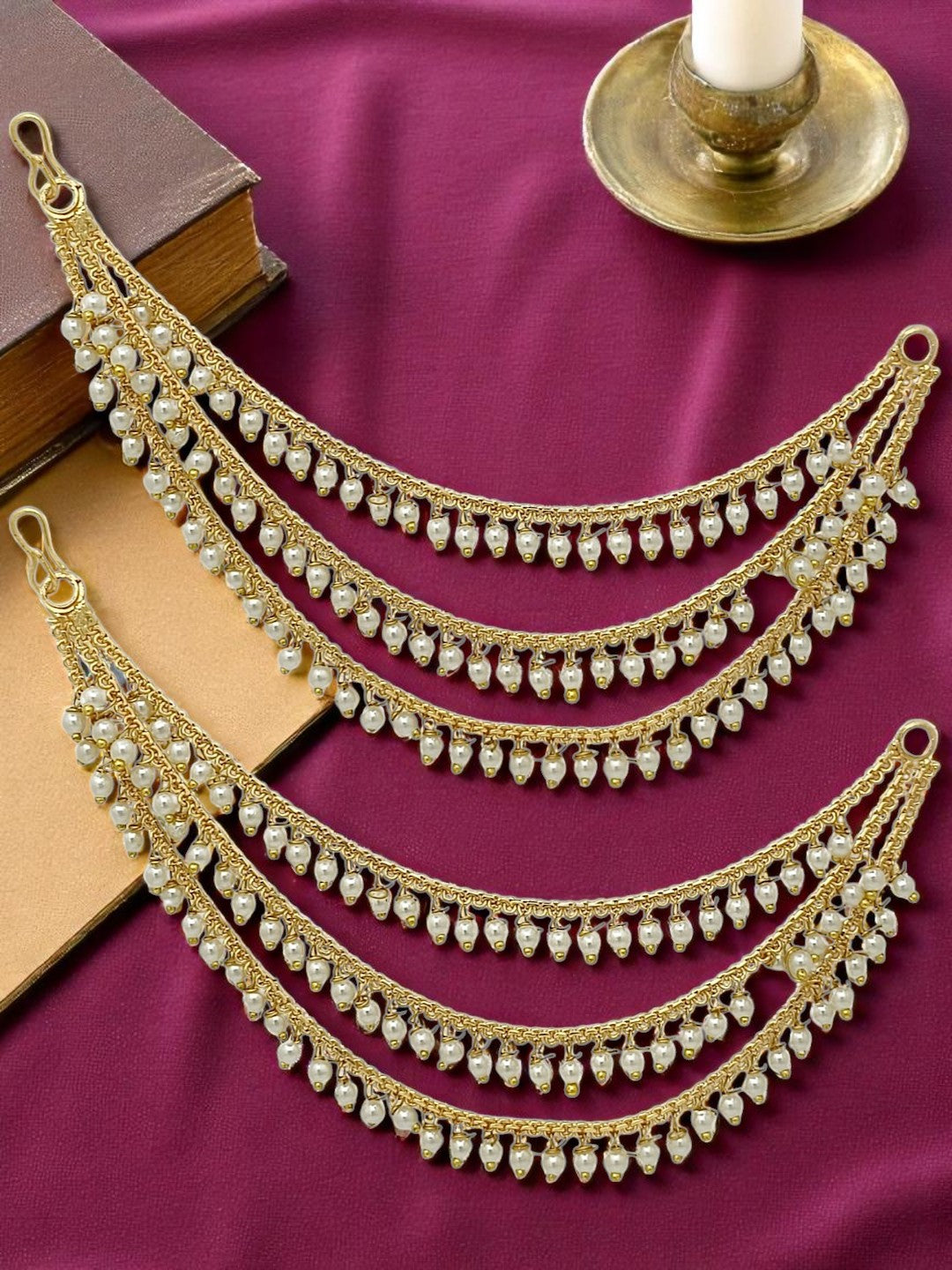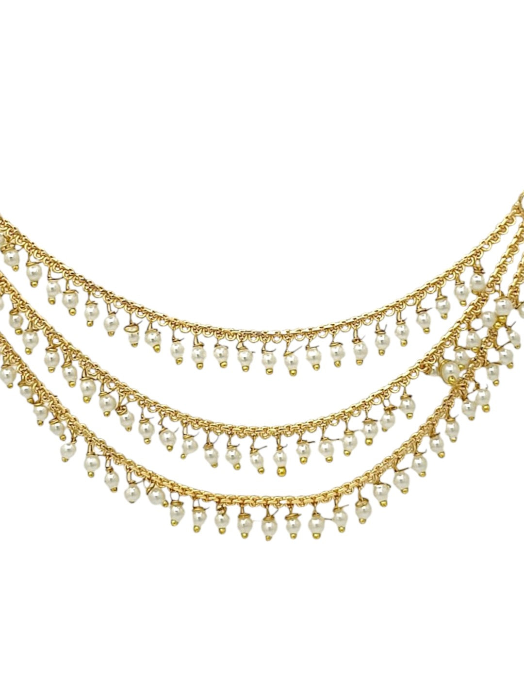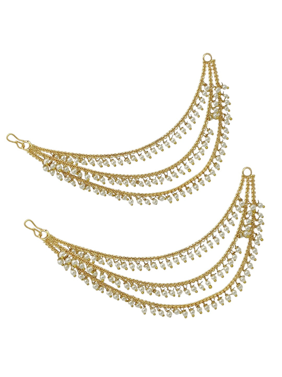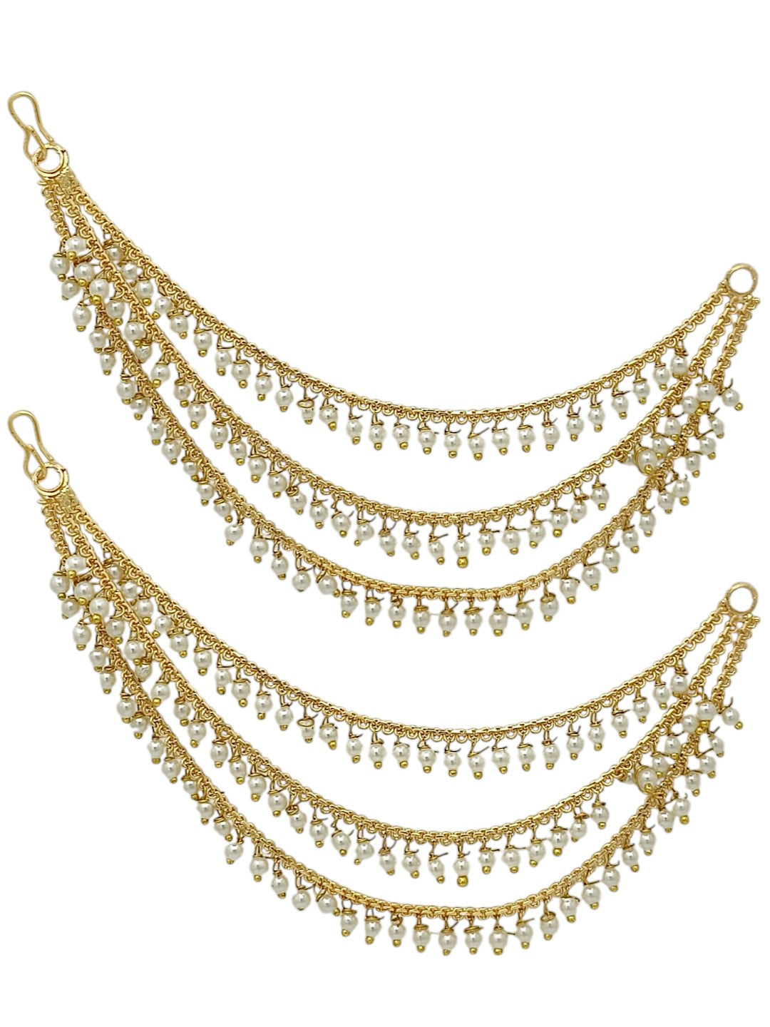 Gold Toned 3 Layered Earchain With Hanging White Beads. Secured With S-Hook Closure.